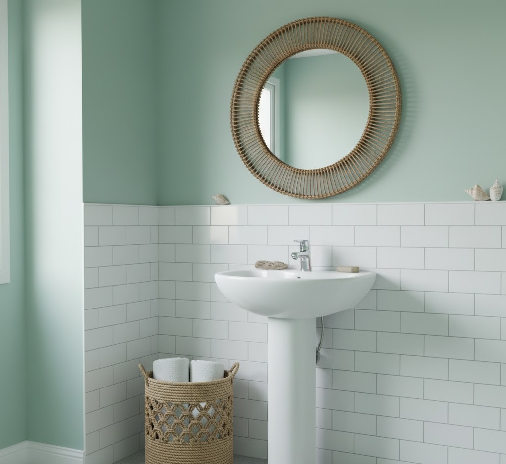 Embrace the refreshing allure of the seaside with coastal small bathroom savings, bringing a breezy, relaxed vibe to your compact space. This style typically features a palette of light blues, sandy beiges, and crisp whites, evoking the calming colours of the ocean and shore. Natural textures are key, incorporating elements like rattan, rope, and driftwood, often through accessories or mirror frames. The mood is fresh, airy, and effortlessly relaxed, transforming your bathroom into a tranquil escape. Functionality is enhanced with open shelving and compact vanities, ensuring practicality without compromising on that charming, beach-house feel, all achievable on a modest budget.