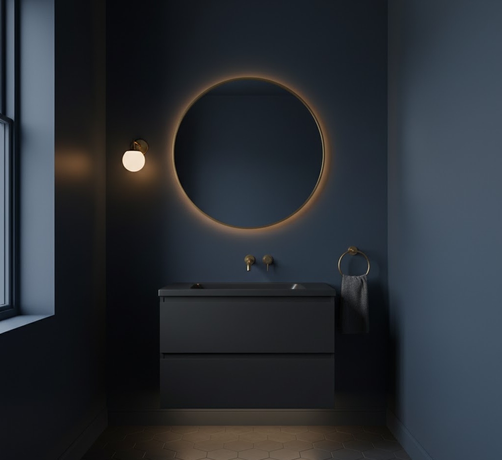 Create a dramatic and intimate retreat with a dark and moody small bathroom, proving that compact spaces can handle bold, rich colours. This style embraces deep blues, emerald greens, charcoal greys, and blacks, often complemented by metallic accents in gold or brass. The mood is sophisticated, cosy, and wonderfully luxurious, offering a unique sense of enclosure and comfort. Functionality is enhanced through clever lighting solutions and minimal clutter, allowing the rich textures and colours to shine. Affordable dark painted walls, dark tiles, and strategically placed gold or brass fixtures are perfect for achieving this opulent, high-impact look on a budget.