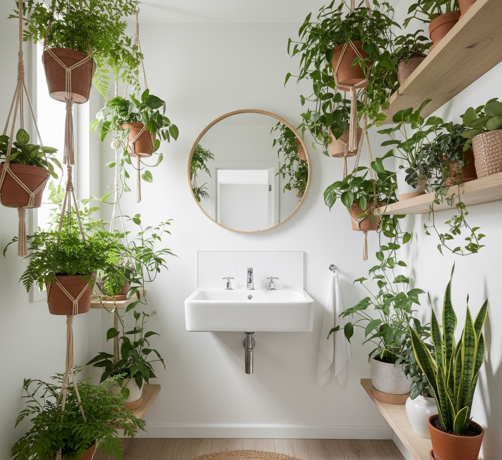 Transform your small bathroom into a tranquil oasis with a greenery focused budget bath, bringing the calming essence of nature indoors. This style celebrates an abundance of plants, natural textures, and earthy colours like whites, greens, and browns. The mood is wonderfully tranquil and revitalising, creating a serene escape from the urban hustle. Functionality is enhanced with plant-friendly shelving and simple fixtures that allow the lush foliage to take centre stage. Affordable white walls, natural wood accents, and a variety of potted plants in terracotta or woven containers are perfect for cultivating this refreshing, nature-inspired sanctuary.
