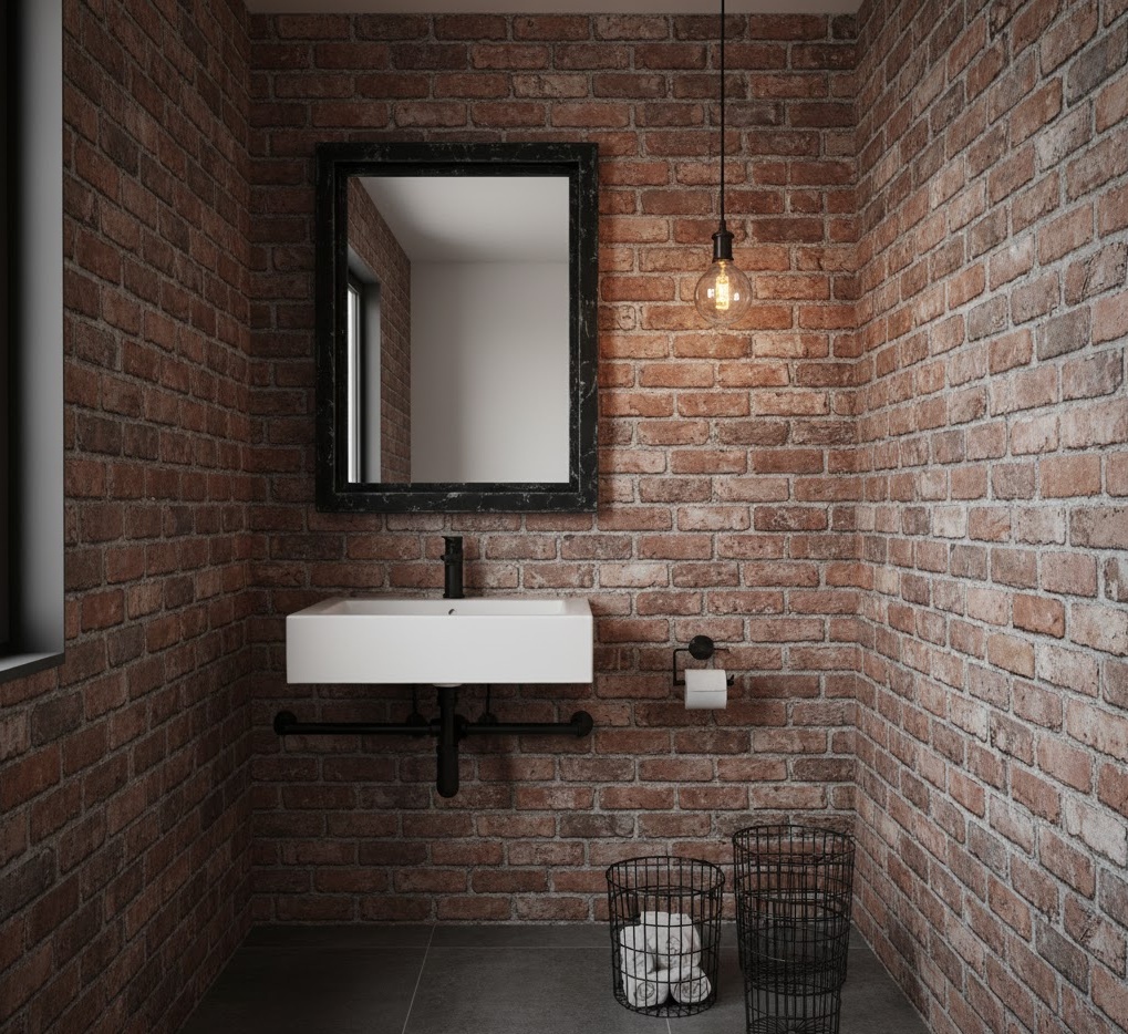 Inject raw, urban edge into your compact washroom with an industrial budget bathroom design, celebrating exposed elements and utilitarian aesthetics. This style often showcases materials like concrete, brick, and metal, creating a robust and authentic feel. Darker colour palettes, including greys, blacks, and deep blues, are frequently accented with metallic finishes in black or chrome. The mood is edgy, functional, and distinctly modern, perfect for those who appreciate a no-nonsense approach to design. Functionality is prioritised with open pipe shelving and simple, robust fixtures, proving that a high-impact industrial look can be achieved affordably in any small space.