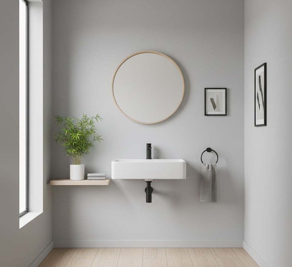 Prioritise clever solutions for tiny washrooms with a space saving small bathroom design, where functionality and efficiency are paramount. This style focuses on innovative fixtures like wall-mounted basins, corner units, and integrated storage to free up valuable floor space. Light colours and reflective surfaces are often employed to enhance the feeling of openness and prevent the room from feeling cramped. The mood is efficient, organised, and surprisingly spacious, proving that even the smallest bathroom can be highly functional. Affordable compact fixtures, floating shelves, and light-coloured tiles are essential for creating this smart, budget-friendly, and highly practical space.