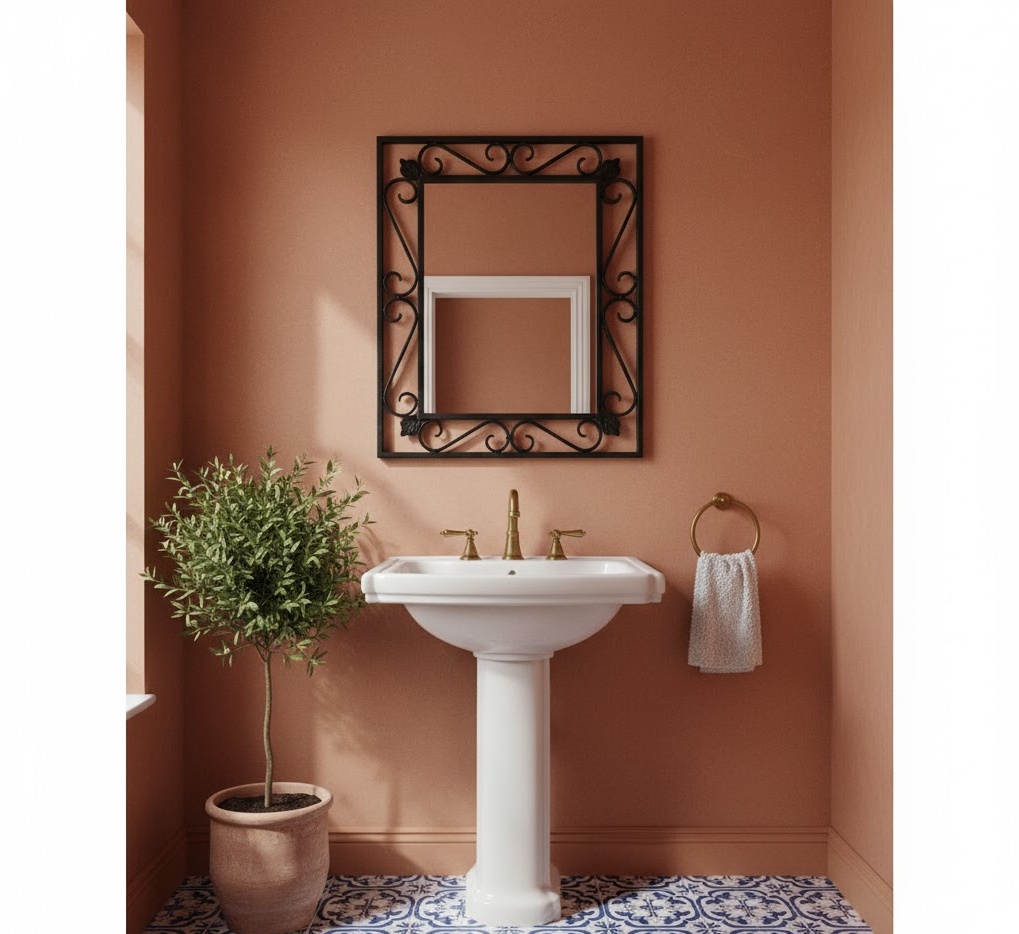 Bring the sun-drenched warmth of the Mediterranean to your compact space with a small bathroom featuring vibrant flair. This inviting style is characterised by rich terracotta tones, deep blues, and olive greens, often complemented by patterned tiles and wrought iron accents. The mood is sunny, relaxed, and wonderfully inviting, transporting you to a coastal villa. Functionality is enhanced through open shelving for displaying colourful towels and natural light, creating an airy feel. Affordable terracotta-effect tiles, painted walls, and simple white fixtures are perfect for capturing this vibrant, holiday-inspired aesthetic without a lavish budget.