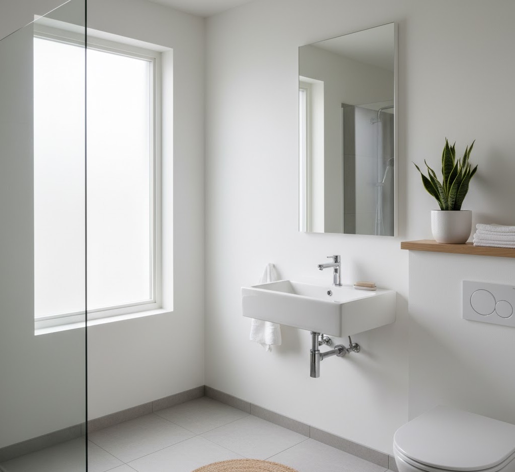 Maximise light and create an illusion of spaciousness with a bright and airy budget bath, perfect for making compact rooms feel larger and more inviting. This style predominantly uses crisp whites, soft pastels, and reflective surfaces to bounce light around the room. The mood is uplifting, spacious, and wonderfully fresh, promoting a sense of calm and openness. Functionality is key, with open shelving, large mirrors, and clear glass elements to prevent visual clutter. Affordable white tiles, light paint colours, and minimalist fixtures are ideal for achieving this expansive and refreshing aesthetic without a significant financial outlay.