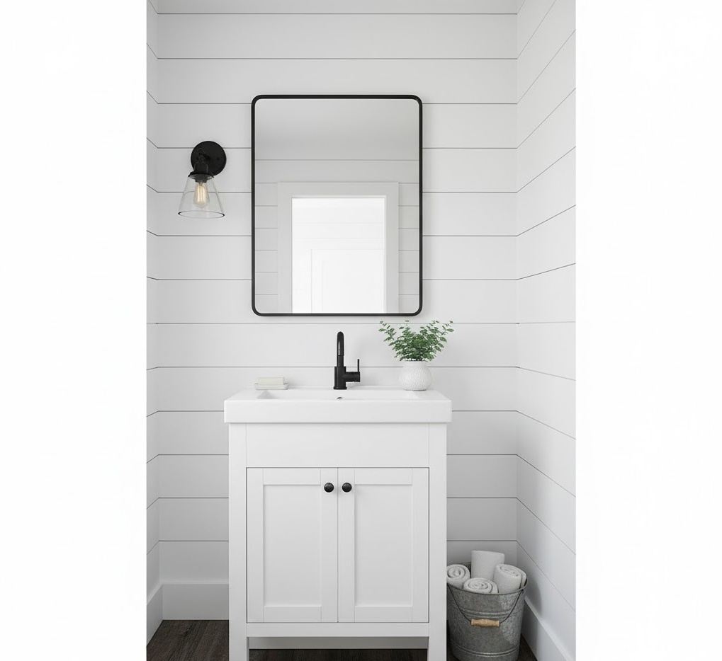 Achieve a charming blend of rustic warmth and contemporary simplicity with a modern farmhouse budget bath. This popular style features elements like shiplap, distressed wood, and striking black metal accents, creating a welcoming and homely atmosphere. The colour palette typically revolves around crisp whites, soft greys, and natural wood tones, offering a fresh yet cosy feel. The mood is inviting and comfortable, perfect for creating a relaxed sanctuary. Functionality is key, with open shelving for displaying charming accessories and compact vanities that fit seamlessly into smaller spaces, proving that this sought-after look is entirely achievable on a budget.