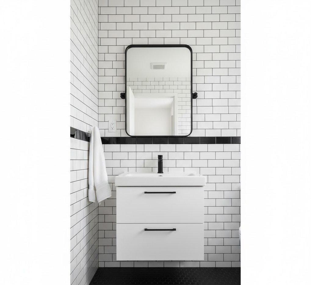 Make a bold statement with a monochrome small bathroom on a budget, utilising the timeless contrast of black, white, and shades of grey. This style creates a sleek, modern, and highly graphic appeal, adding instant sophistication to any compact space. The high contrast design ensures a striking visual impact, making the mood sophisticated and undeniably chic. Functionality is maintained through simple, uncluttered layouts and streamlined fixtures that enhance the contemporary aesthetic. Affordable materials such as black and white tiles, black matte fixtures, and crisp white painted walls are perfect for achieving this dramatic yet elegant look without overspending.