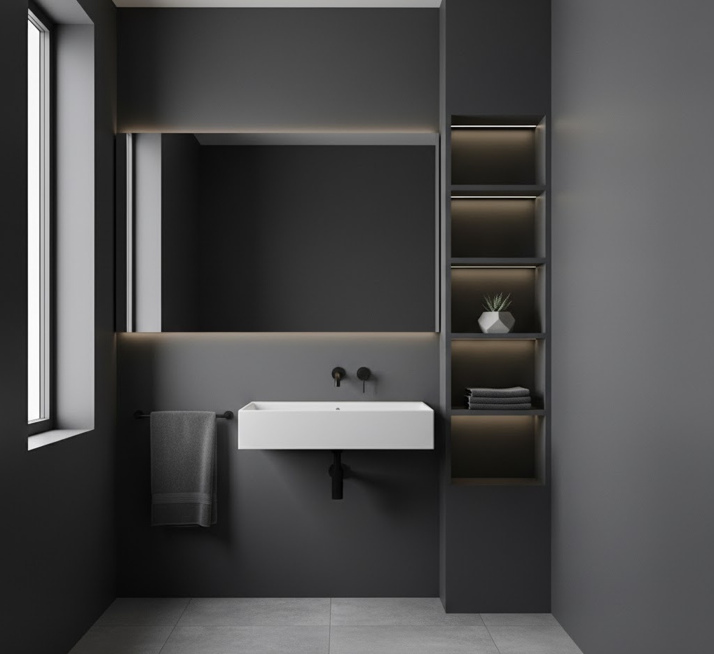 For city dwellers and those with limited space, urban compact bathroom ideas offer sleek, sophisticated, and highly functional solutions. This style often incorporates darker neutrals like charcoal grey and black, complemented by metallic accents in chrome or black matte, creating a chic, contemporary vibe. Wall-mounted fixtures, floating vanities, and clever integrated storage are paramount, ensuring every inch is utilised efficiently. The mood is sophisticated and efficient, reflecting a modern, minimalist aesthetic. Affordable large-format grey tiles, dark painted walls, and compact, streamlined sanitaryware make this smart, space-saving design accessible for any budget.