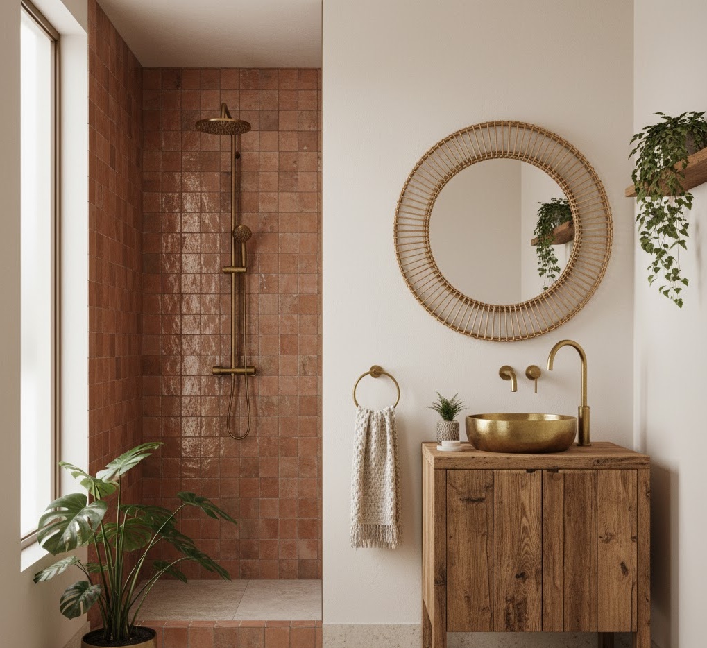 Inject free-spirited charm into your compact area with a Boho small bathroom shower, blending eclectic textures, natural elements, and a relaxed, artistic vibe. This style embraces a warm, earthy colour palette of terracotta, olive green, cream, and natural wood tones, often with pops of vibrant colour through accessories. Materials are chosen for their organic feel, such as zellige tiles, woven rattan accents, macrame wall hangings, and reclaimed wood vanity units. Functionality is enhanced by creative storage like woven baskets and open shelving for displaying plants and artisanal soaps. The mood is one of relaxed comfort and global inspiration, transforming a small bathroom into a unique, soulful retreat that feels both personal and incredibly inviting.
