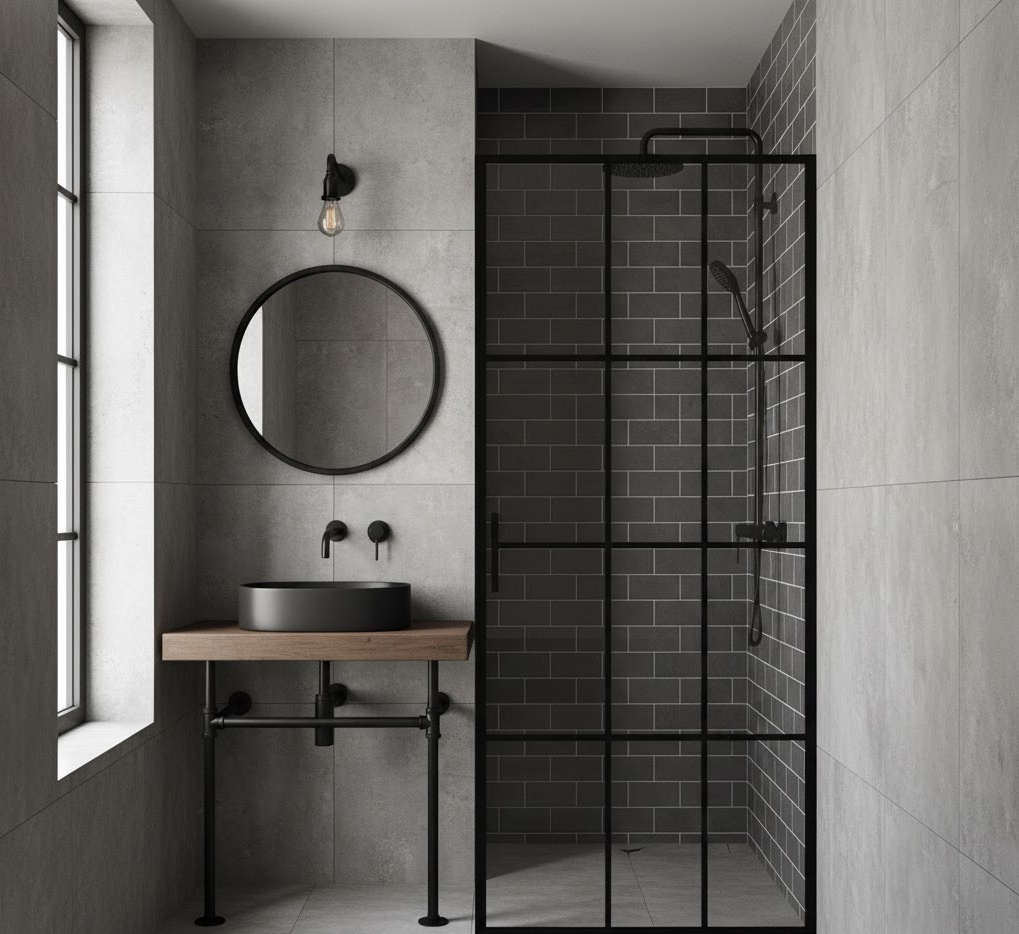 Capture the essence of city living with an urban loft shower solution, blending industrial edge with contemporary comfort for a stylish small bathroom. This design features a cool colour palette of greys, blacks, and whites, often with exposed brick or concrete accents to evoke a warehouse aesthetic. Materials are chosen for their robust, utilitarian appeal, such as concrete-effect tiles, black metal-framed shower screens, and sleek, minimalist fixtures. Functionality is paramount, with space-saving solutions like wall-mounted toilets and compact vanity units, ensuring every inch is utilised efficiently. The mood is one of sophisticated urbanity and practical chic, transforming a small bathroom into a modern, edgy retreat that feels both functional and incredibly stylish.