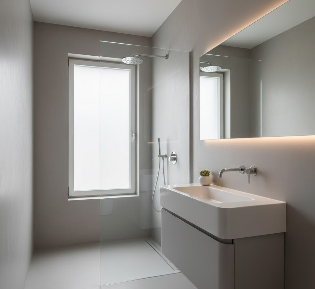 Embrace serene simplicity with a minimalist small shower bathroom, focusing on clean lines and uncluttered spaces to maximise the feeling of openness and create a tranquil sanctuary. This design typically features a sophisticated neutral colour palette of crisp whites, muted greys, and soft beiges, which collectively work to create a calm, expansive, and incredibly inviting atmosphere, even within the most compact of urban dwellings. Materials are meticulously chosen for their understated elegance, superior durability, and ease of maintenance, often including large format porcelain or microcement for seamless walls and floors, alongside frameless glass shower screens that visually expand the area. Functionality is paramount, with integrated, hidden storage solutions and sleek, wall-mounted fixtures that free up valuable floor space, while a walk-in shower design, often with a linear drain, eliminates visual barriers and enhances accessibility. The overall mood is one of tranquil efficiency and refined sophistication, transforming a tiny washroom into a highly functional, aesthetically pleasing, and remarkably spacious-feeling retreat.