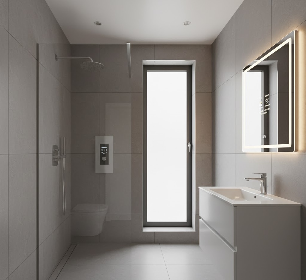 Step into the future with a smart tech shower bathroom, integrating innovative technology to enhance comfort, efficiency, and luxury in a small space. This design often features a sleek, minimalist aesthetic with a neutral colour palette of whites, greys, and blacks, allowing the technology to be the focal point. Materials are chosen for their contemporary appeal and ease of integration, such as large format porcelain tiles, seamless glass, and touch-sensitive or voice-controlled fixtures. Functionality is elevated with features like digital shower controls, smart mirrors with integrated lighting and displays, and perhaps even a Bluetooth speaker system. The mood is one of cutting-edge convenience and modern luxury, transforming a small bathroom into a highly efficient and sophisticated personal hub.