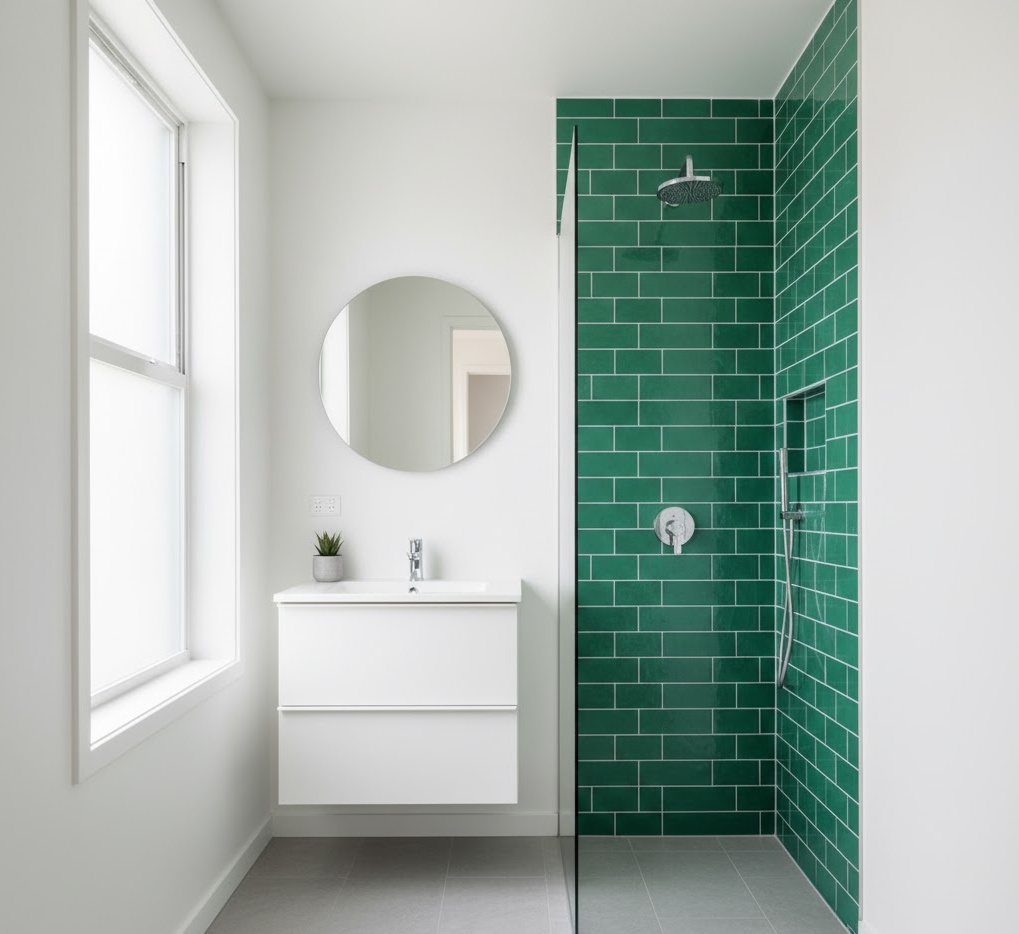 Inject energy and personality into your compact space with a vibrant pop shower bathroom, using a burst of colour to create a playful and memorable design. This style typically features a predominantly neutral backdrop of white or light grey, allowing a single bold colour – such as emerald green, sunny yellow, or electric blue – to shine in the shower area. Materials are chosen for their ability to carry colour effectively, like glossy ceramic tiles or painted waterproof panels, complemented by simple white fixtures to avoid visual clutter. Functionality is maintained by keeping the rest of the bathroom streamlined, ensuring the vibrant element is a joyful accent rather than an overwhelming feature. The mood is one of cheerful modernity and spirited individuality, transforming a small bathroom into a lively and inspiring space.