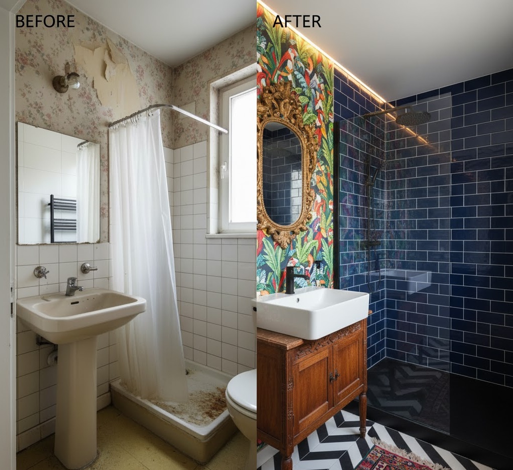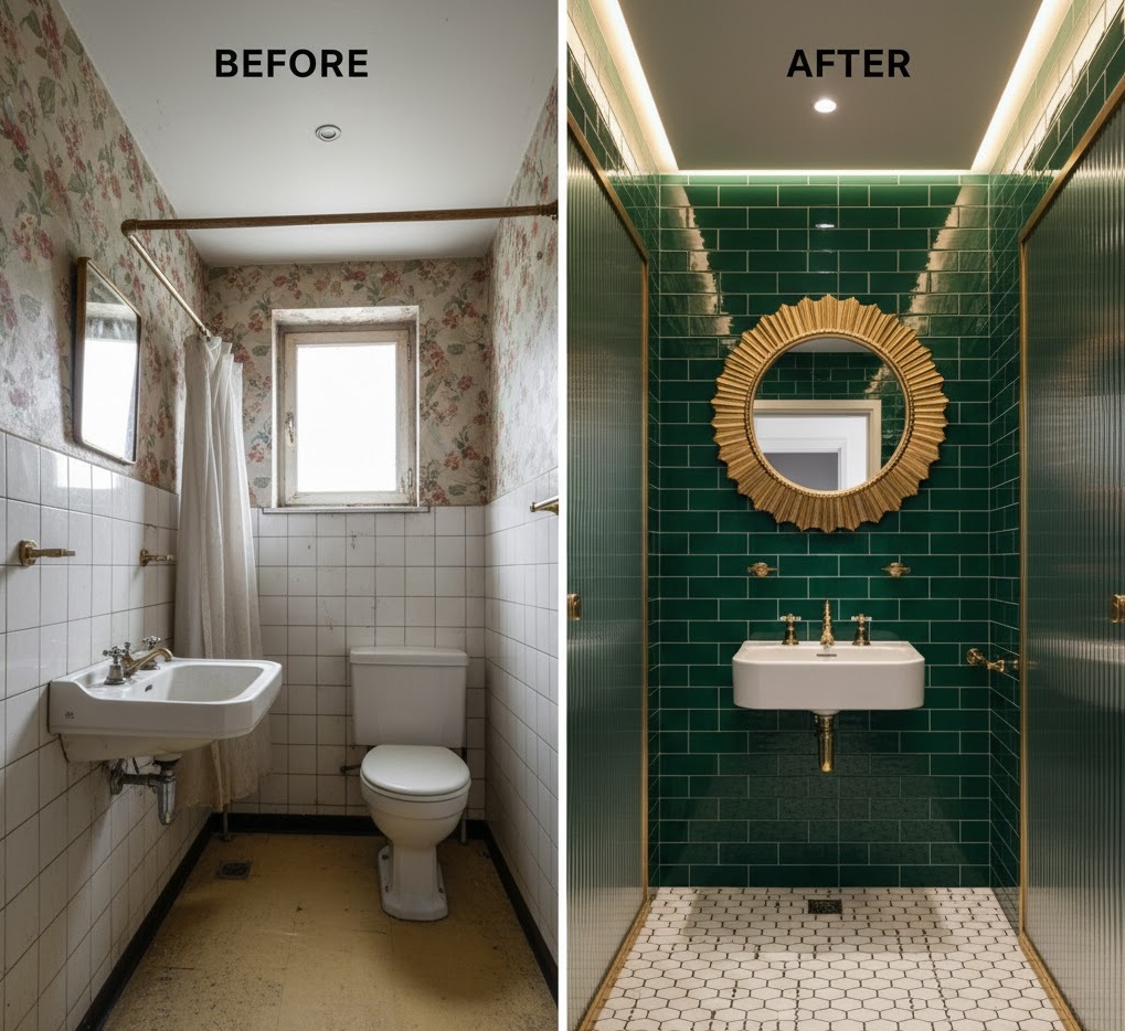 An Art Deco small bathroom remodel brings a touch of 1920s glamour and geometric sophistication to a compact space. This luxurious style often features a bold colour palette of deep greens, navy blues, or black, accented with gold or chrome. Materials like polished marble, mirrored surfaces, and geometric patterned tiles are key, creating a sense of opulence and drama. Functionality is enhanced by elegant, period-appropriate fixtures and clever use of reflective surfaces to expand the perceived space. The ‘before’ to ‘after’ transformation delivers a truly distinctive and glamorous washroom, celebrating the iconic elegance of the Art Deco era.