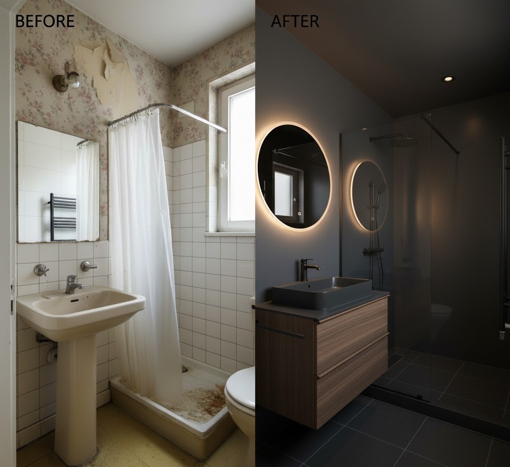 A luxurious small bathroom makeover proves that opulence isn’t exclusive to large spaces, transforming a compact area into a high-end sanctuary. This style often features a sophisticated colour palette of deep jewel tones, rich neutrals, or classic black and white, accented with metallic finishes like gold or brass. Materials such as marble, high-gloss cabinetry, and bespoke tiling are key, creating an indulgent and refined atmosphere. Functionality is elevated with premium fixtures, integrated smart technology, and custom storage solutions. The ‘before’ to ‘after’ journey delivers an exquisite washroom that feels incredibly lavish and utterly pampering.
