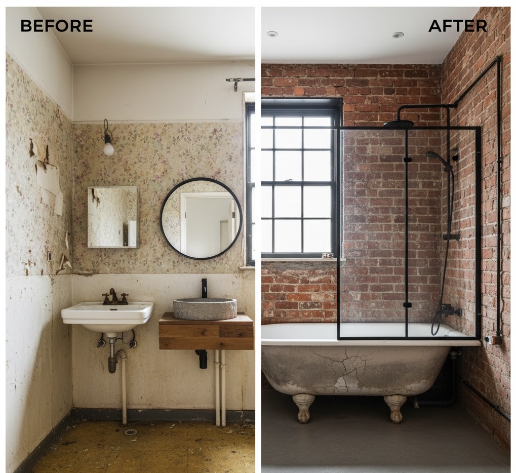 An industrial small bathroom renovation brings an edgy, urban aesthetic to even the most compact spaces. This design celebrates raw materials and utilitarian elements, often showcasing exposed brickwork, concrete finishes, and black metal accents. A muted colour scheme of greys, blacks, and deep browns dominates, creating a sophisticated yet rugged atmosphere. Functionality is key, with robust fixtures like exposed pipework showers and simple, sturdy vanities. The ‘before’ to ‘after’ transformation highlights the beauty in unfinished textures and practical design, resulting in a unique and characterful washroom that feels both modern and timeless.
