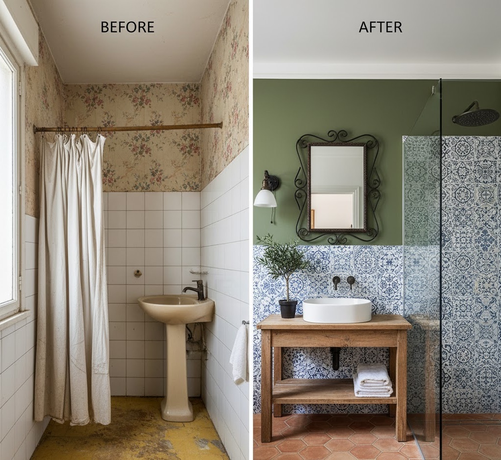 A Mediterranean small bathroom remodel evokes the sun-drenched charm of coastal Europe, bringing warmth and character to a compact space. This style typically features a rich colour palette of terracotta, deep blues, olive greens, and creamy whites, reminiscent of the sea and earth. Materials like patterned ceramic tiles, stucco-effect walls, wrought iron accents, and natural wood are key to achieving this rustic yet elegant look. Functionality is enhanced by open shelving and practical, durable surfaces. The ‘before’ to ‘after’ transformation creates a vibrant, inviting washroom that feels like a holiday escape, full of warmth and timeless appeal.