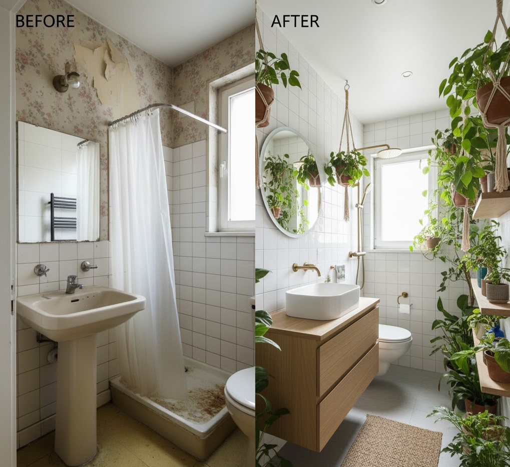 Bring the outdoors in with an urban jungle small bathroom remodel, transforming a compact space into a vibrant, plant-filled sanctuary. This style thrives on a fresh colour palette of greens, whites, and natural wood tones, creating a lively and refreshing atmosphere. Key materials include natural wood accents, white or light-coloured tiles, and an abundance of carefully chosen houseplants that thrive in humidity. Functionality is enhanced by clever shelving and hanging solutions for plants, alongside practical, easy-to-clean surfaces. The ‘before’ to ‘after’ journey creates a unique, biophilic washroom that feels invigorating and connected to nature, even in the heart of the city.