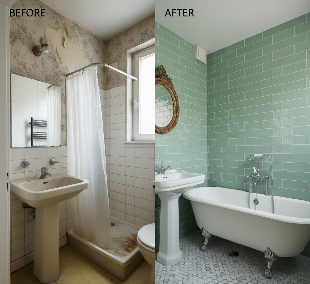 A vintage small bathroom makeover injects timeless charm and character into a compact space, celebrating design elements from bygone eras. This aesthetic often features a pastel colour palette – think mint green, pale pink, or sky blue – paired with classic black and white accents. Materials like hexagonal floor tiles, subway wall tiles with dark grout, and traditional sanitaryware such as a clawfoot tub or pedestal sink are key. Functionality is enhanced by period-appropriate fixtures and clever storage solutions that complement the vintage feel. The ‘before’ to ‘after’ transformation creates a nostalgic yet fresh washroom, full of personality and historical elegance.