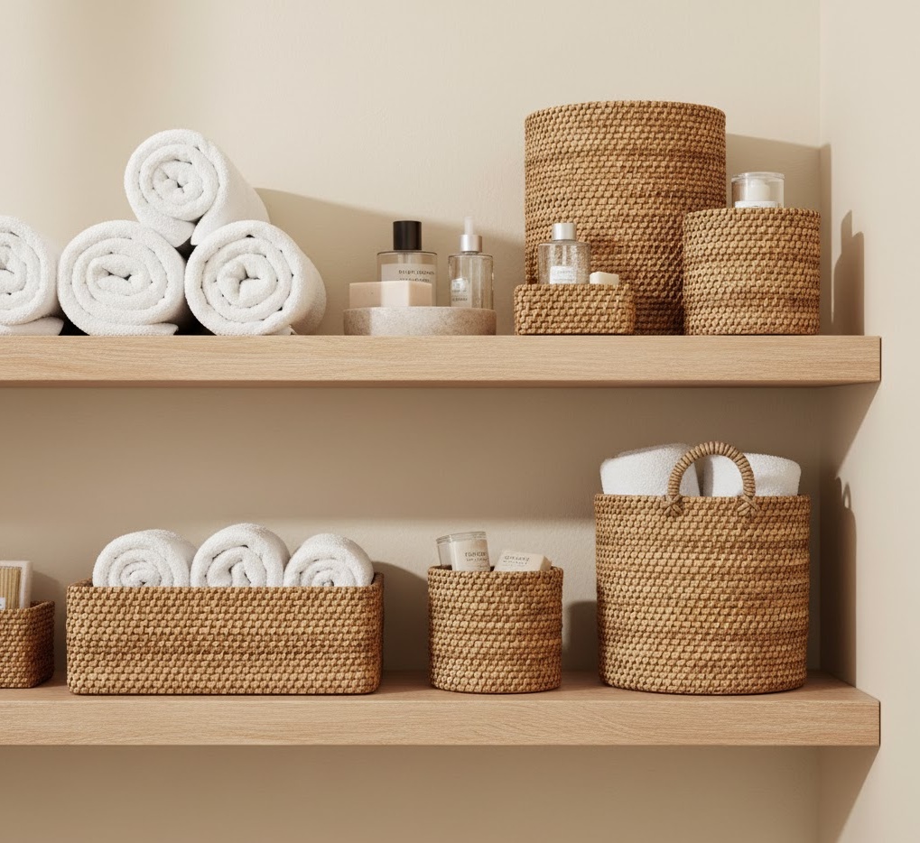 Basket organisers offer a flexible and aesthetically pleasing small bathroom storage idea, perfect for adding texture and warmth to a compact space. Woven from natural materials like rattan, wicker, or seagrass, or crafted from durable fabric or metal, they provide versatile containment for various items. These charming baskets can be placed on open shelves, inside cabinets, or even on the floor, helping to categorise and conceal clutter. They are ideal for storing towels, hair products, or cleaning supplies, maintaining an organised and inviting atmosphere. Their natural textures and organic shapes contribute to a relaxed and homely feel, enhancing the bathroom’s overall design.
