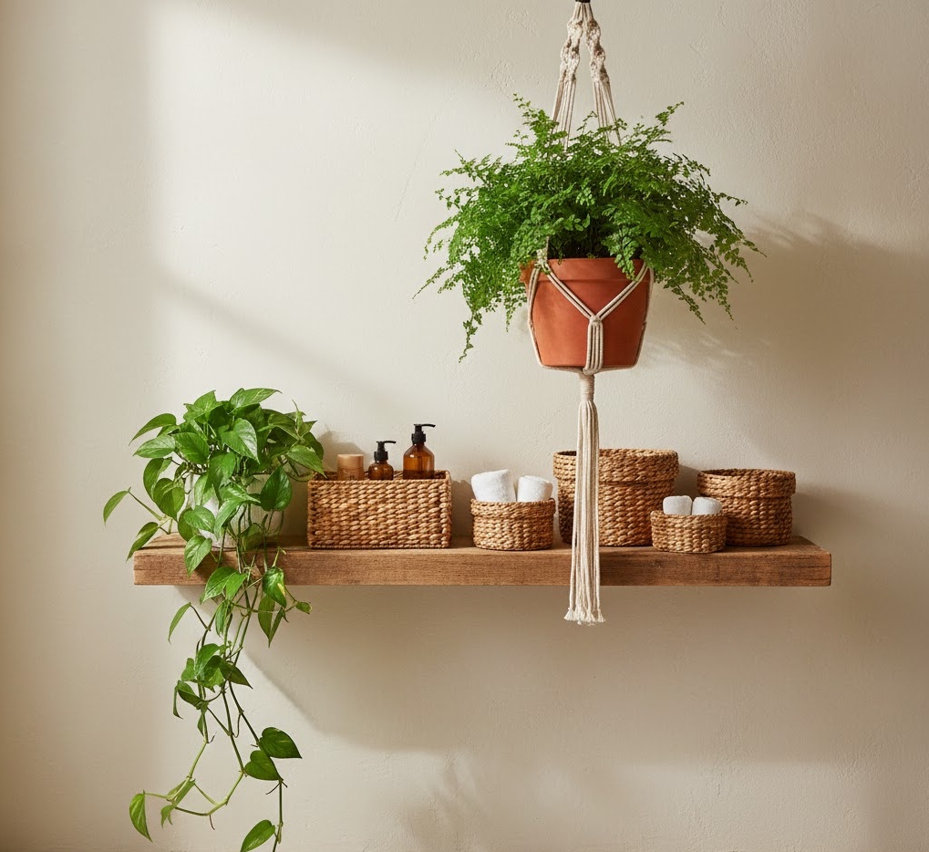 Boho chic small bathroom storage ideas infuse a relaxed, eclectic, and natural vibe into compact spaces. This style embraces natural materials, woven textures, and a touch of global inspiration. Storage solutions include woven baskets made from rattan or seagrass, macrame hanging shelves, and rustic wooden units. The colour palette often features earthy tones, warm whites, and pops of muted colours, creating a cosy and inviting atmosphere. Lush green plants are essential, adding life and freshness. This approach to storage is about creating a personal sanctuary, where functionality meets free-spirited design, making a small bathroom feel warm, unique, and full of character.