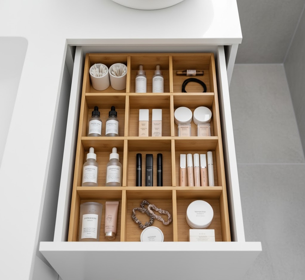 Drawer dividers are an essential small bathroom storage idea for optimising internal organisation and preventing clutter within vanity units and cabinets. These clever inserts, available in materials like bamboo, plastic, or adjustable metal, create specific compartments for different items. They are perfect for neatly separating cosmetics, toiletries, hair accessories, or cleaning supplies, ensuring everything has its designated place. The mood is one of meticulous order and efficiency, transforming chaotic drawers into highly functional storage zones. This simple yet effective solution maximises the utility of existing storage, making it easier to find what you need and maintain a tidy small bathroom.