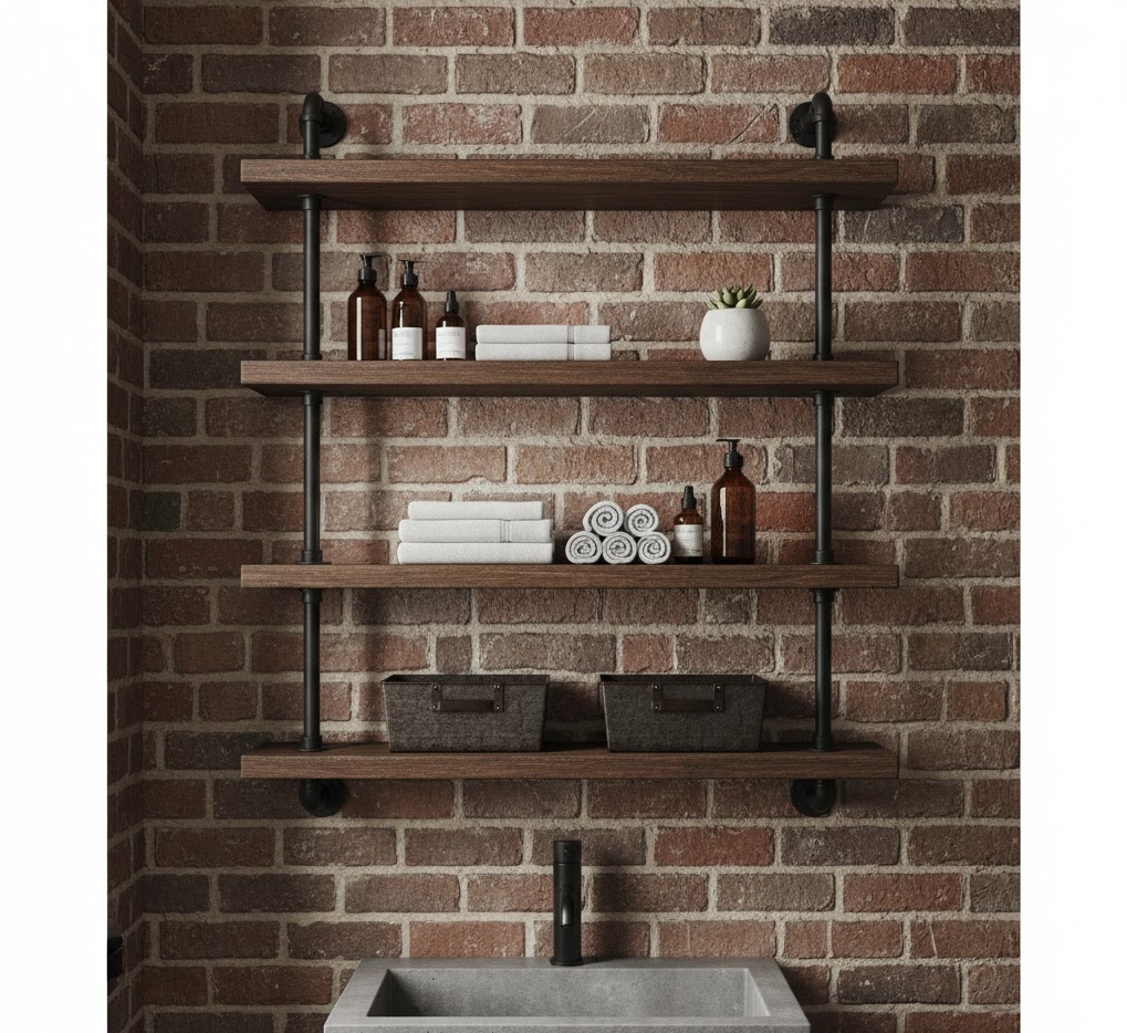 Industrial small bathroom storage ideas bring a raw, urban edge to compact spaces, celebrating utilitarian design and robust materials. Think exposed metal piping, black steel frames, reclaimed wood shelves, and concrete accents. Storage solutions often include open shelving units with visible fixings, metal locker-style cabinets, or simple wooden crates. The colour palette typically features dark greys, blacks, and natural wood tones, creating a moody yet functional atmosphere. This style is perfect for those who appreciate a no-nonsense, durable aesthetic, where storage is both practical and a key design feature, adding character and efficiency to a small bathroom.