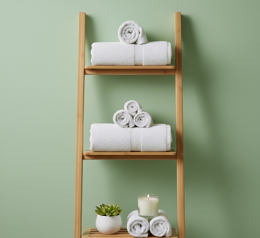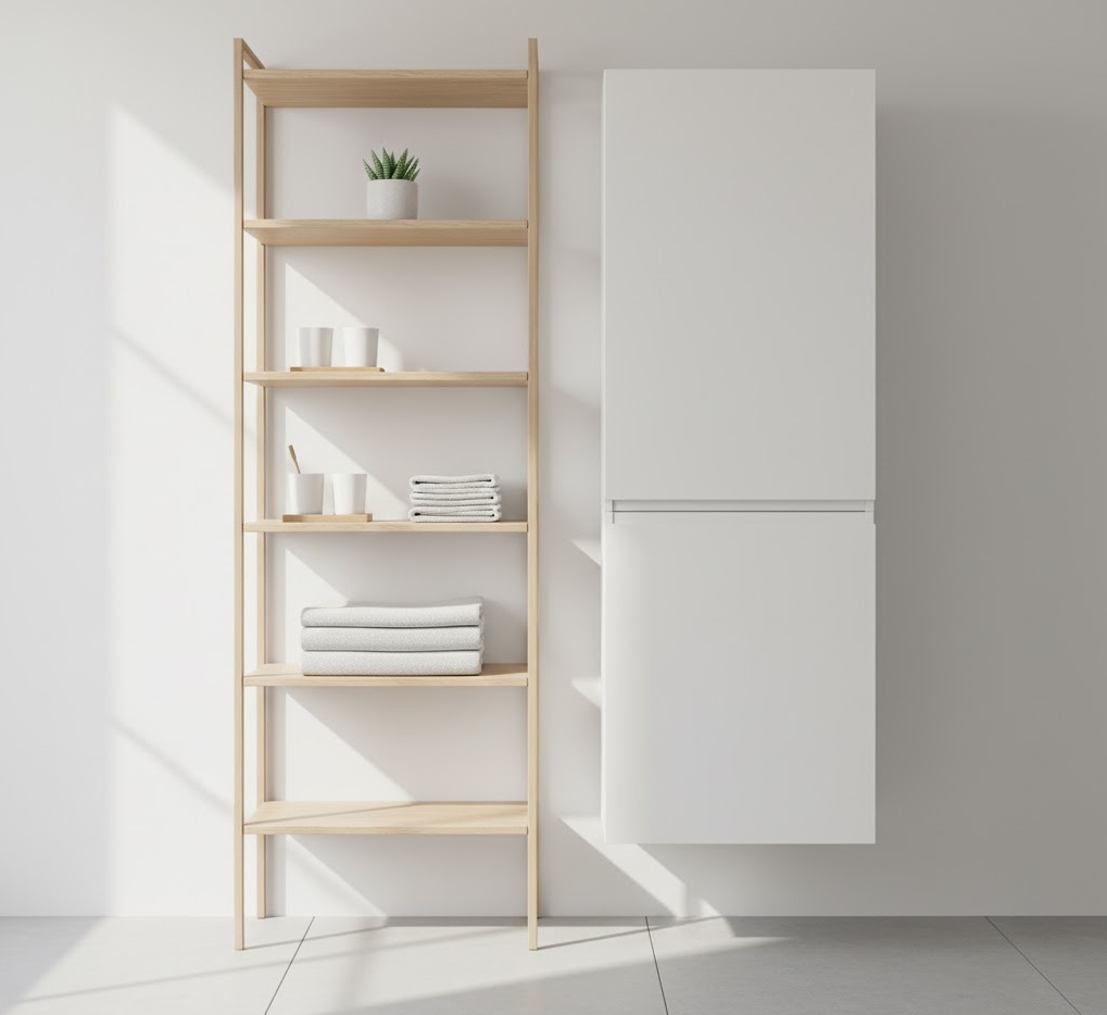A ladder shelf provides a stylish and versatile small bathroom storage idea, blending aesthetic appeal with practical functionality. Its leaning design offers open shelving that is perfect for displaying neatly folded towels, decorative items, or small potted plants, adding character to a compact space. Typically crafted from natural wood like bamboo or light oak, or sleek metal in black or white, it introduces a contemporary yet relaxed vibe. This freestanding unit is easy to move and doesn’t require wall mounting, making it ideal for renters or those who prefer flexible arrangements. It’s an excellent way to add visual interest and accessible storage without feeling bulky.