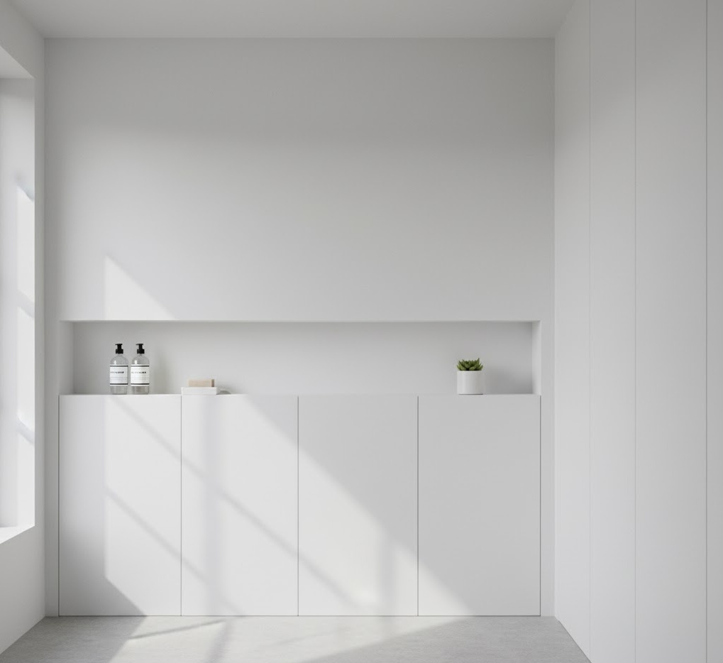 Hidden small bathroom storage ideas are all about creating a seamless, clutter-free environment by concealing items behind discreet panels and integrated units. This approach is ideal for achieving a minimalist aesthetic where visual simplicity is paramount. Solutions include push-to-open cabinets that blend into the wall, storage behind large mirrors, or pull-out units integrated into vanity designs. Materials often match the surrounding walls or cabinetry, such as matte white, light wood, or sleek laminates, ensuring a cohesive look. The mood is one of serene order, where functionality is cleverly disguised, making a small bathroom feel incredibly spacious and impeccably tidy.