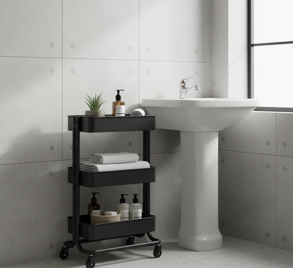 A mobile trolley cart is a highly versatile and practical small bathroom storage idea, offering flexible organisation that can adapt to your needs. Typically constructed from metal, often in matte black or chrome, or from wood, these carts feature multiple tiers of shelving or baskets. Their castor wheels allow for easy movement, meaning you can pull them out when needed and tuck them away when not in use, making them perfect for compact spaces. They are ideal for holding toiletries, cleaning supplies, or even a stack of fresh towels, keeping essentials within reach. This adaptable solution provides convenient, on-demand storage without permanent installation.