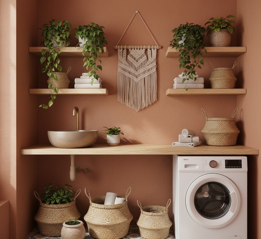 Infuse your small laundry space with a free-spirited boho chic design, combining eclectic elements with natural textures. This style embraces a warm, earthy colour palette, often incorporating vibrant patterns through textiles or tiles. Woven baskets, macramé wall hangings, and potted plants add a touch of organic charm and personality. Open shelving allows for decorative displays, while practical storage solutions are often disguised within stylish, handcrafted pieces. It’s about creating a relaxed, artistic, and functional area that feels uniquely personal and inviting, making laundry day a more enjoyable experience.