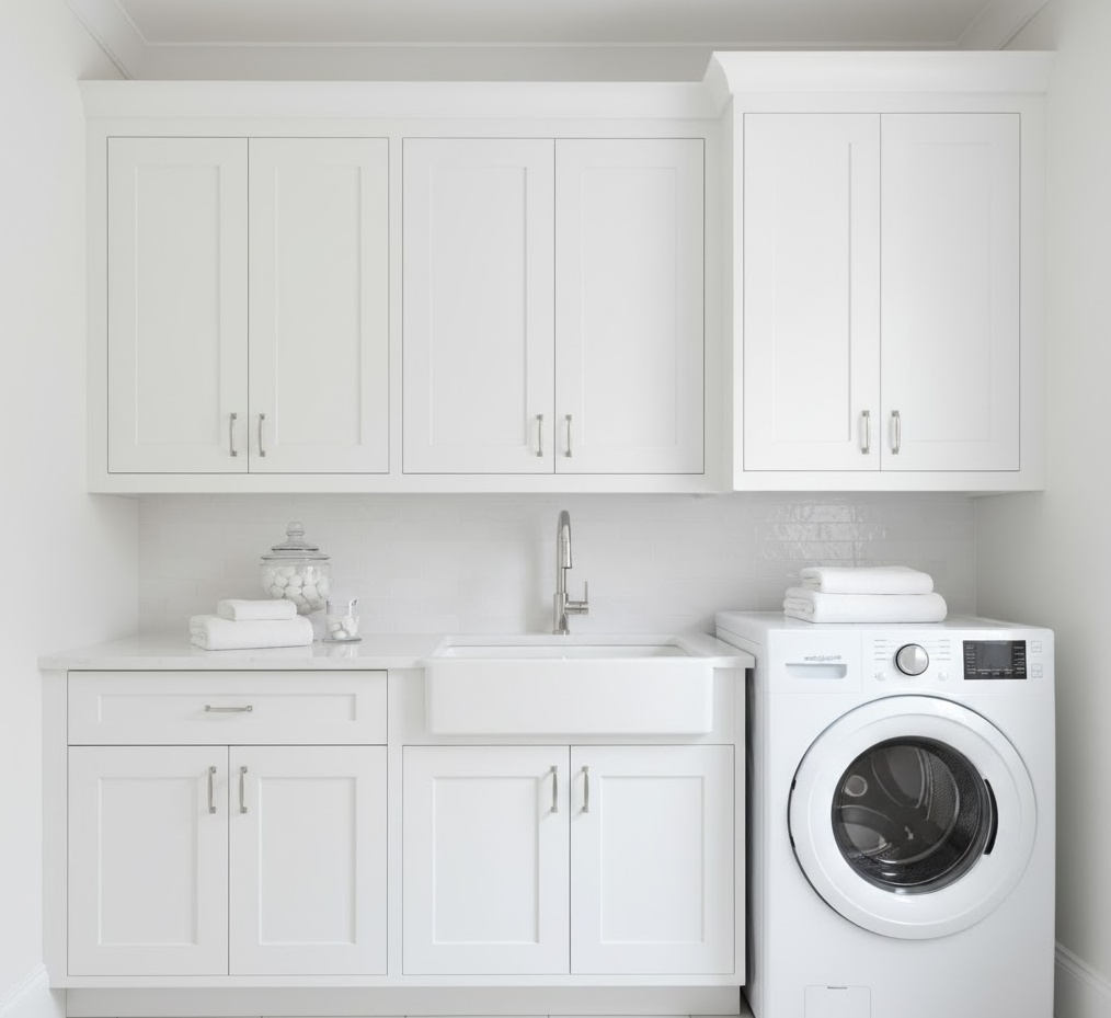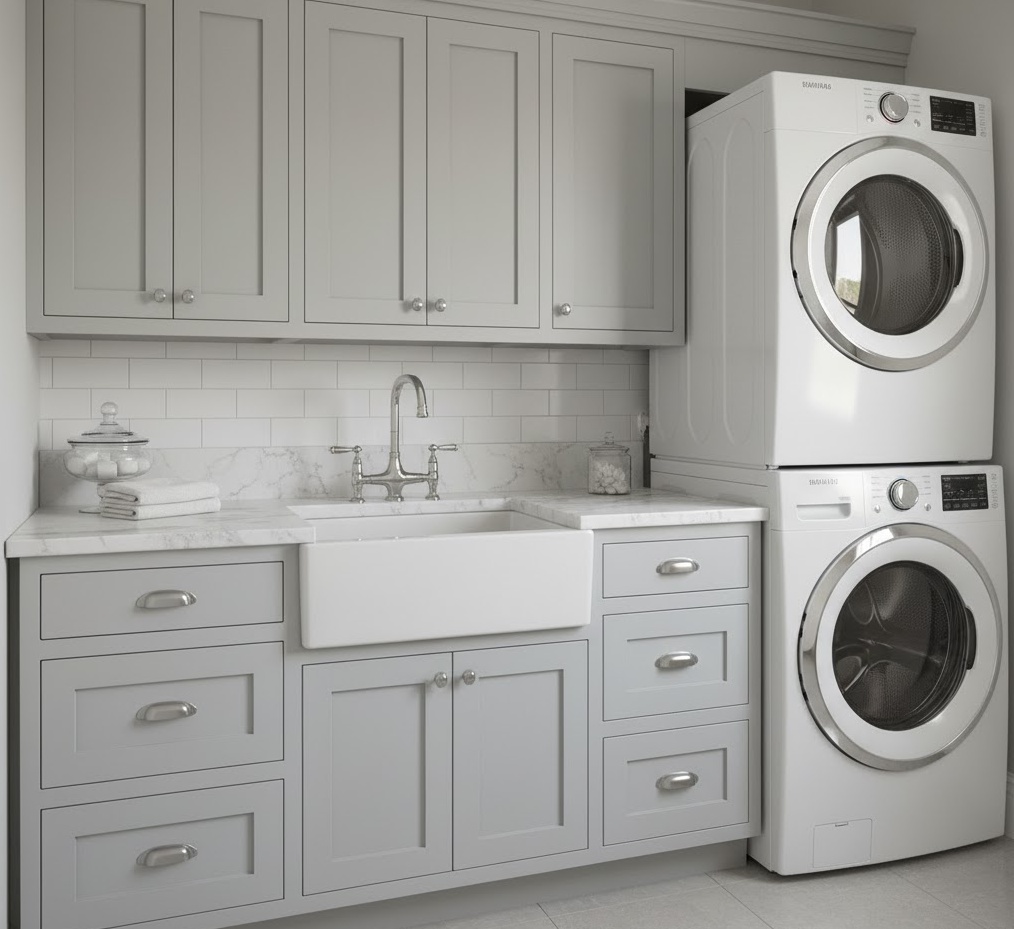 A classic elegant laundry design brings timeless sophistication to a small utility space. This style features traditional cabinetry, often in shaker or raised-panel designs, painted in refined colours like soft greys, creams, or muted blues. Polished chrome or brass hardware, marble-effect countertops, and subtle decorative mouldings add a touch of luxury. Functionality is seamlessly integrated with ample storage behind closed doors and a well-organised layout. It’s about creating a refined, enduring aesthetic that makes the laundry room feel like a graceful extension of the home, rather than a purely utilitarian area.