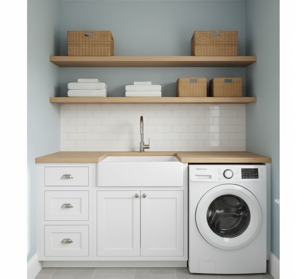 The Scandinavian laundry nook design champions simplicity, functionality, and natural light. Characterised by a bright, airy feel, it uses a palette of whites, light greys, and natural wood tones. Clean lines, minimal ornamentation, and practical storage solutions are key, often featuring open shelving or simple, handleless cupboards. The emphasis is on creating a calm and organised space where natural materials like birch or pine add warmth. This design ensures that even a compact laundry area feels inviting and highly efficient, embodying the ‘hygge’ concept of cosiness and well-being.