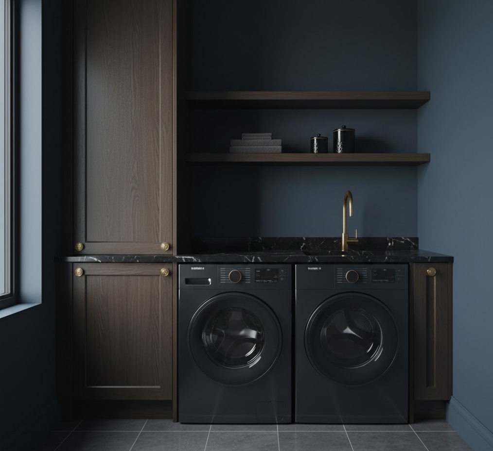 Defy expectations with a dark moody laundry area design, proving that small spaces can handle bold colours. This sophisticated style uses deep hues like charcoal, navy, or forest green on walls and cabinetry, creating an intimate and luxurious atmosphere. Metallic accents in brass or copper add a touch of glamour, while warm, diffused lighting prevents the space from feeling too enclosed. Functionality is key, with integrated appliances and clever storage ensuring efficiency within the dramatic setting. It’s a daring yet elegant approach that transforms a utilitarian space into a stylish statement.