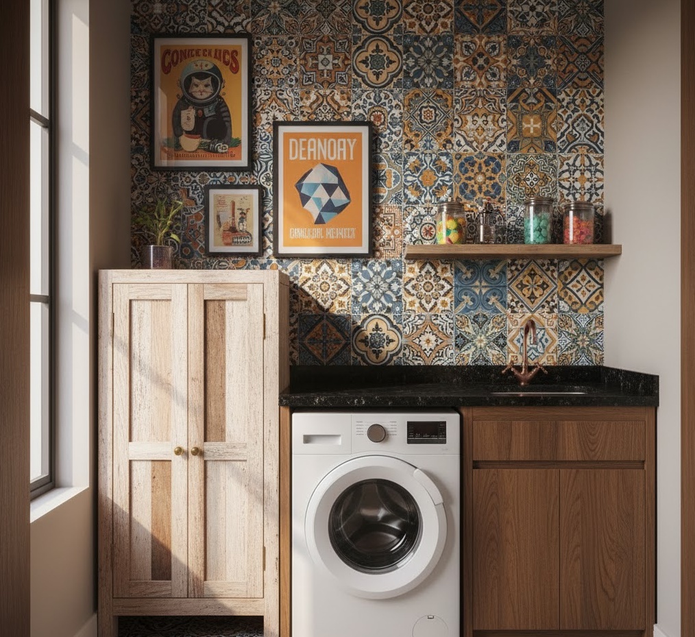 An eclectic small laundry design celebrates individuality and a mix-and-match approach, creating a vibrant and unique space. This style combines elements from different eras or aesthetics, such as vintage tiles with modern appliances, or antique furniture with contemporary art. A bold colour palette, often with contrasting patterns and textures, adds personality and visual interest. Open shelving can display curated collections of quirky items, while practical storage is integrated through a variety of unique pieces. It’s about creating a playful, characterful laundry area that feels truly bespoke and inspiring.