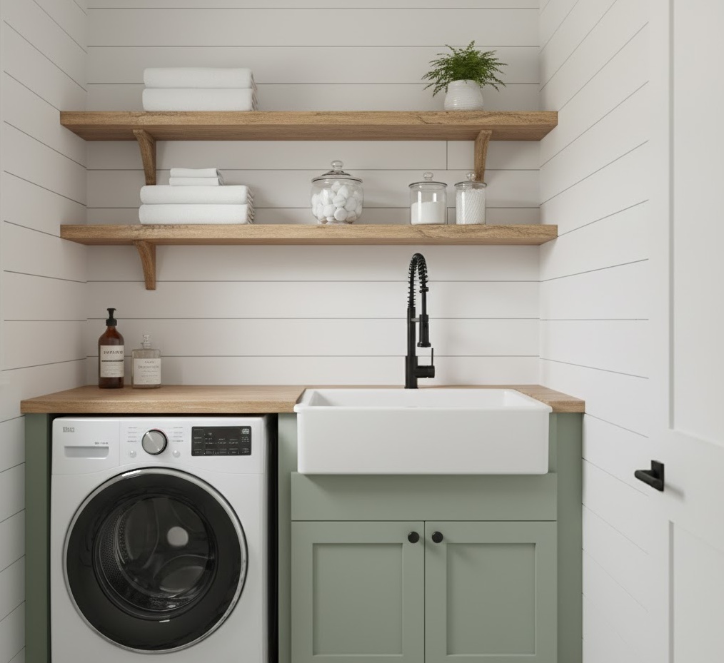 Embrace rustic charm with a farmhouse compact laundry design, blending practicality with cosy aesthetics. This style often features shiplap walls, open shelving crafted from reclaimed wood, and a classic Belfast sink. A palette of soft whites, creams, and natural wood tones creates a warm, inviting atmosphere, complemented by vintage-inspired hardware and woven baskets for storage. Functionality is enhanced by durable surfaces and accessible storage, making laundry chores feel less like a task and more like a pleasant routine. It’s about creating a homely, functional space that feels both authentic and efficient.