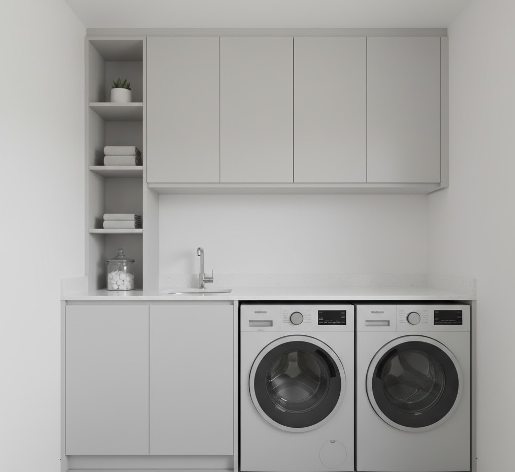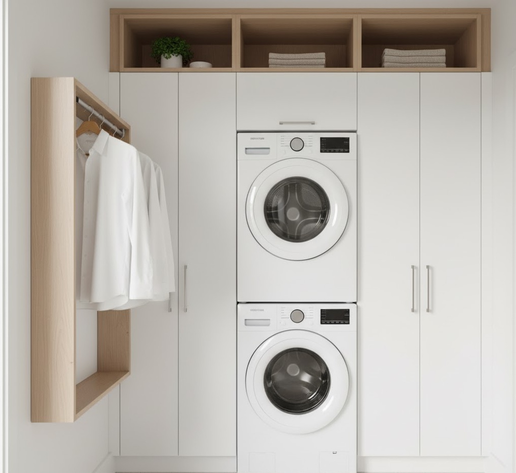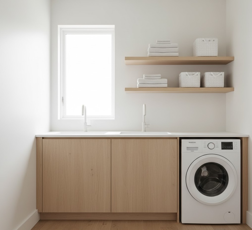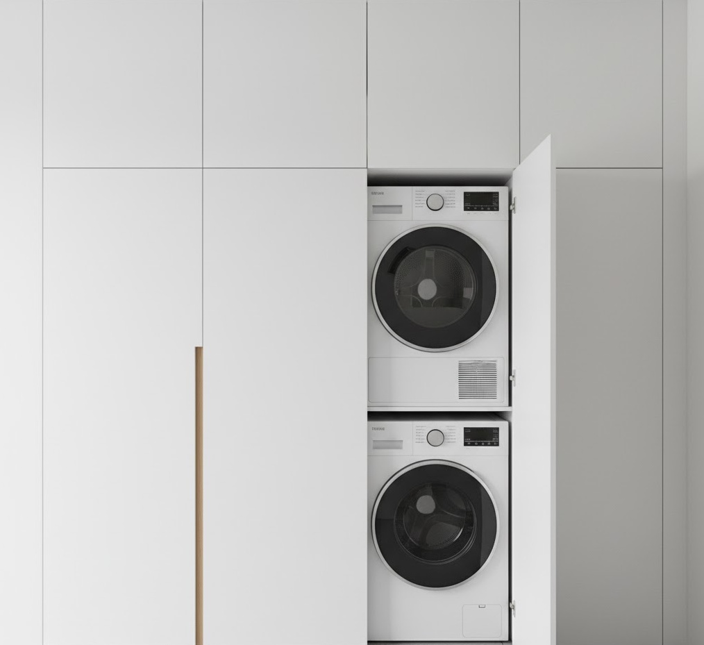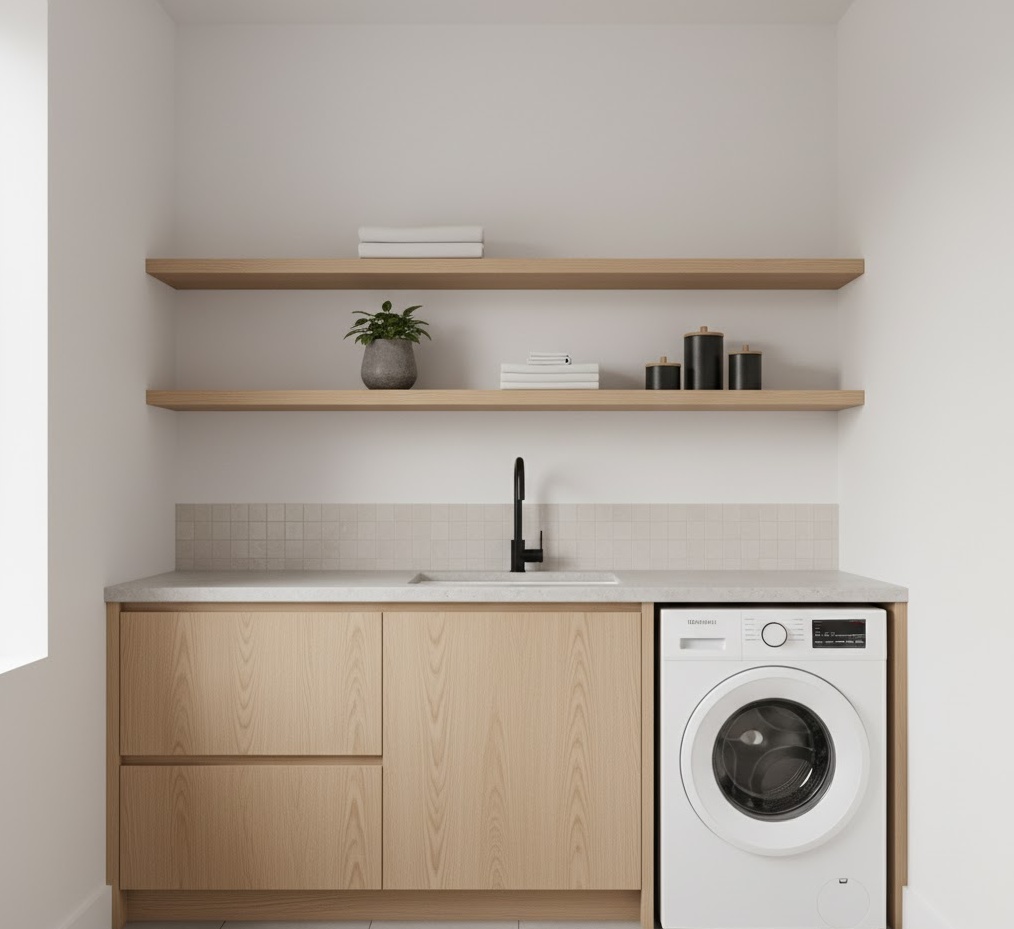 The Japandi laundry nook design beautifully merges Japanese minimalism with Scandinavian warmth, creating a serene and highly functional space. This style features clean lines, natural materials like light wood and bamboo, and a muted colour palette of whites, greys, and earthy tones. The emphasis is on simplicity, craftsmanship, and a clutter-free environment, with integrated storage solutions and carefully chosen, functional items. It’s about creating a tranquil, harmonious area where every element serves a purpose, promoting a sense of calm and order in your compact laundry space.