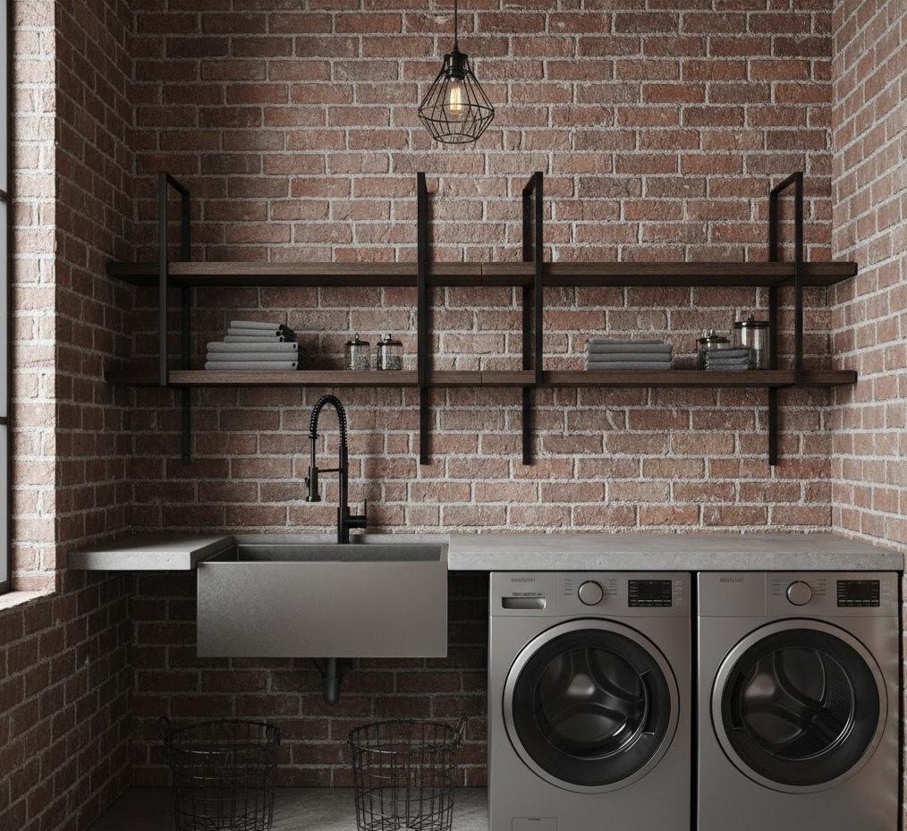 An industrial small washroom design celebrates raw materials and utilitarian aesthetics. Exposed brickwork, concrete finishes, and metallic accents like black steel or copper piping are central to this look. The colour scheme is typically muted, featuring greys, blacks, and earthy tones, allowing the textures of the materials to stand out. Open shelving made from metal or reclaimed wood provides practical storage, while robust, functional fixtures complete the urban-chic vibe. This design transforms a compact laundry space into a stylish, hard-wearing area that is both practical and visually striking.