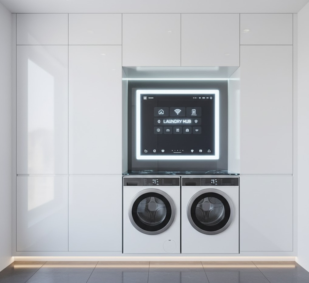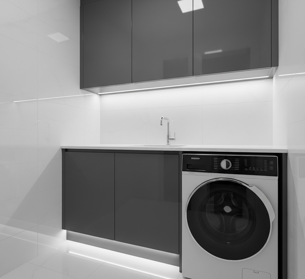 The smart tech laundry zone design integrates cutting-edge technology to streamline chores in a small space. This includes Wi-Fi enabled appliances, smart lighting systems, and automated storage solutions. The aesthetic is often modern and minimalist, with sleek finishes and a neutral colour palette to highlight the technology. Functionality is paramount, with every device and system designed to enhance convenience and efficiency, from remote-controlled cycles to sensor-activated drying. This design transforms a compact laundry room into a futuristic hub, making laundry tasks effortless and intelligent.