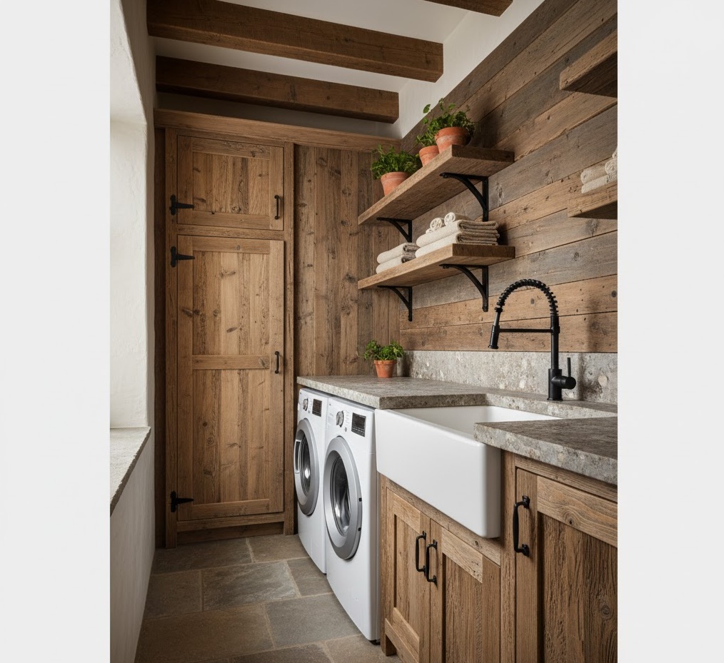 A rustic small laundry room design embraces natural textures, warmth, and a connection to the outdoors. This style often features exposed wooden beams, stone accents, and reclaimed wood cabinetry. A palette of earthy tones, deep greens, and warm browns creates a cosy, inviting atmosphere. Practical elements like a large farmhouse sink and durable surfaces are common, enhancing both functionality and authentic charm. It’s about creating a robust, characterful space that feels grounded and welcoming, making laundry tasks a more pleasant and natural part of your home routine.