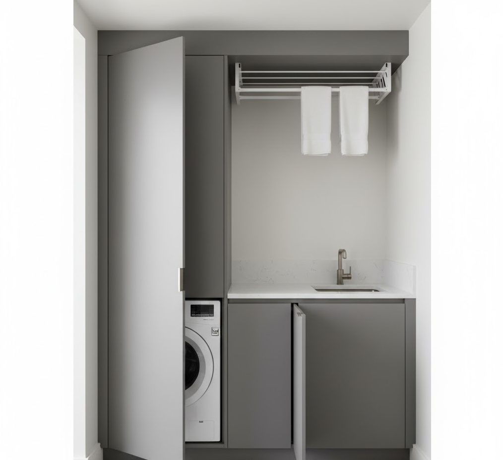 The space-saving laundry unit design focuses on compact, all-in-one solutions that fit into the tightest of spaces. This often involves integrated washer-dryer combos, narrow utility sinks, and wall-mounted drying racks that fold away. Custom-built cabinetry can conceal these units, creating a streamlined look when not in use. A light, neutral colour palette helps to prevent the small area from feeling claustrophobic, while smart storage ensures essentials are always at hand. This design is about ingenious engineering and clever design to make laundry possible in even the most challenging footprints.