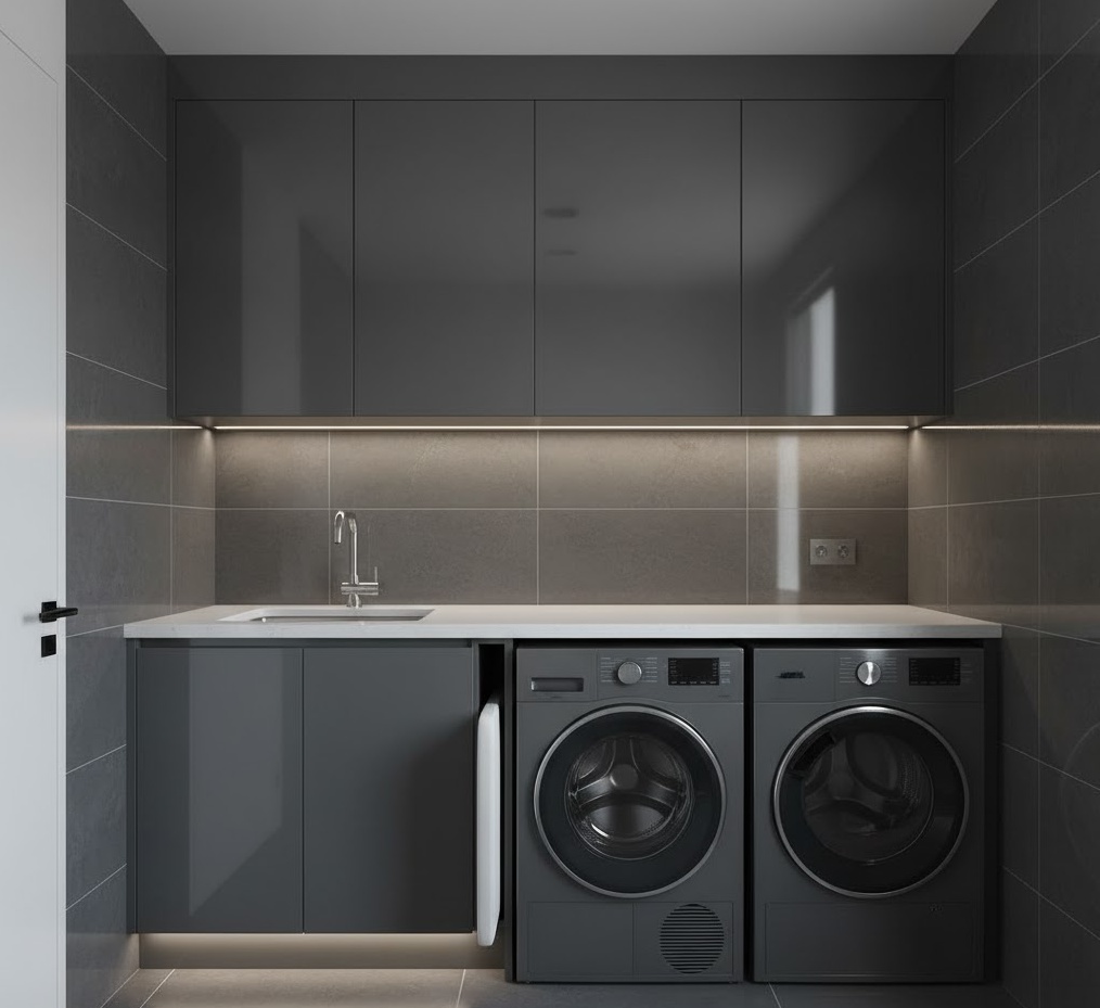 A modern tiny utility room design prioritises sleekness, innovation, and smart technology within a confined footprint. Expect high-gloss cabinetry, integrated LED lighting, and state-of-the-art compact appliances. The colour scheme typically involves crisp whites, deep charcoals, and metallic accents, creating a sophisticated and streamlined look. Every inch is maximised with clever pull-out storage and multi-functional surfaces, ensuring a highly efficient workflow. This design is about creating a contemporary, high-tech laundry zone that is both visually striking and incredibly practical for urban living.
