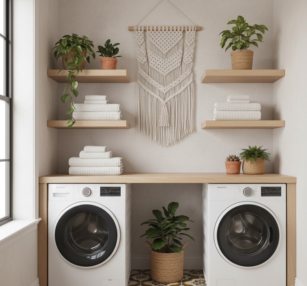 Infuse your laundry space with personality and warmth through a boho chic laundry corner design, embracing eclectic textures and vibrant patterns. This style often features natural wood elements, macrame wall hangings, potted plants, and patterned floor tiles, creating a relaxed and artistic atmosphere. A mix of earthy tones, rich jewel colours, and natural fibres defines the palette, adding depth and visual interest. Functional storage is often achieved with decorative baskets and open shelving displaying unique finds. The mood is one of free-spirited creativity and comfort, making the laundry area feel like a curated extension of your home’s unique style.