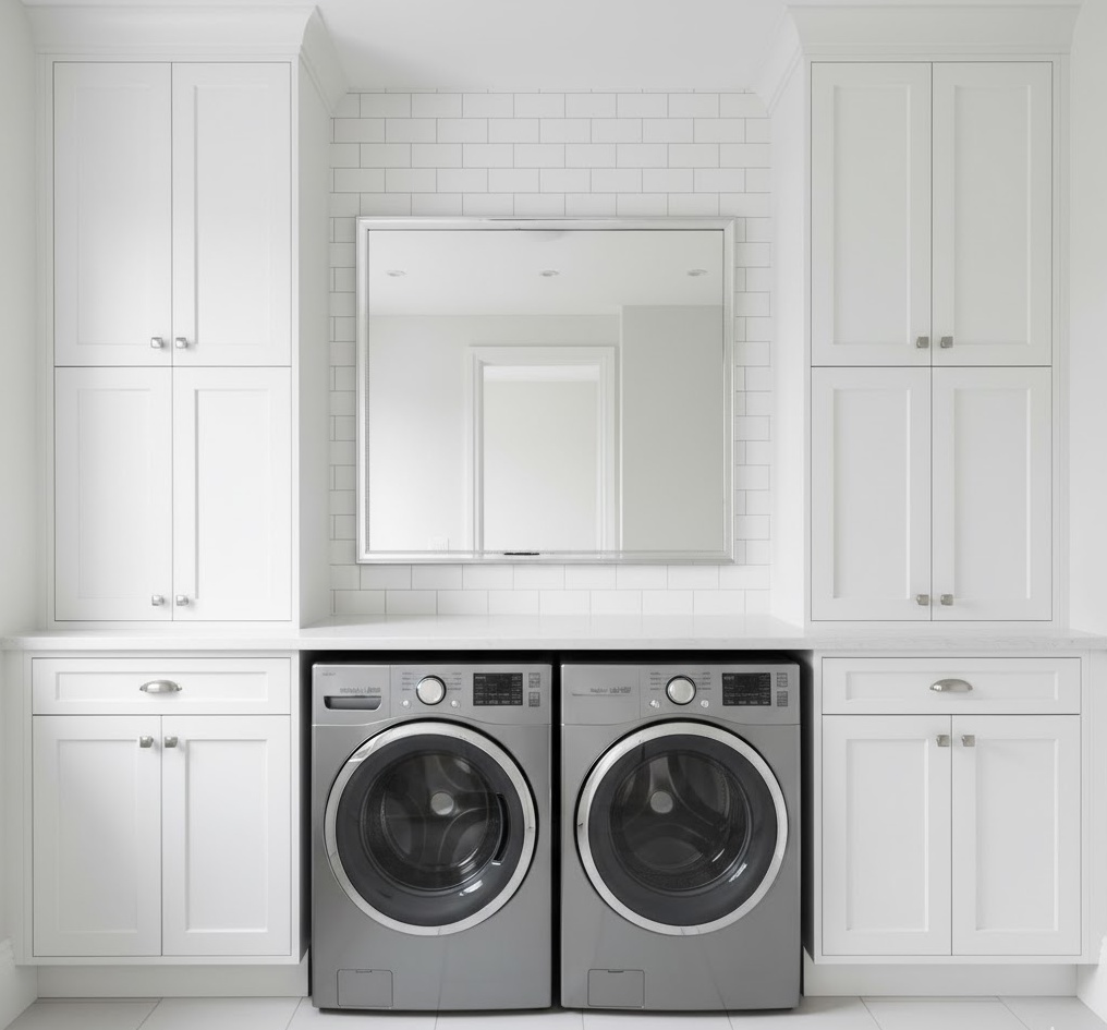 Create an illusion of spaciousness and impeccable cleanliness with a bright white small laundry design, a timeless choice for compact areas. This style features an all-white palette for cabinetry, walls, and often countertops, reflecting light and making the room feel larger and airier. Reflective surfaces, such as glossy tiles or a strategically placed mirror, further enhance the brightness and visual depth. Functionality is streamlined, with simple, clean-lined storage solutions that maintain the pristine aesthetic. The mood is one of crisp freshness and invigorating purity, making the laundry routine feel less of a chore in such an uplifting environment.