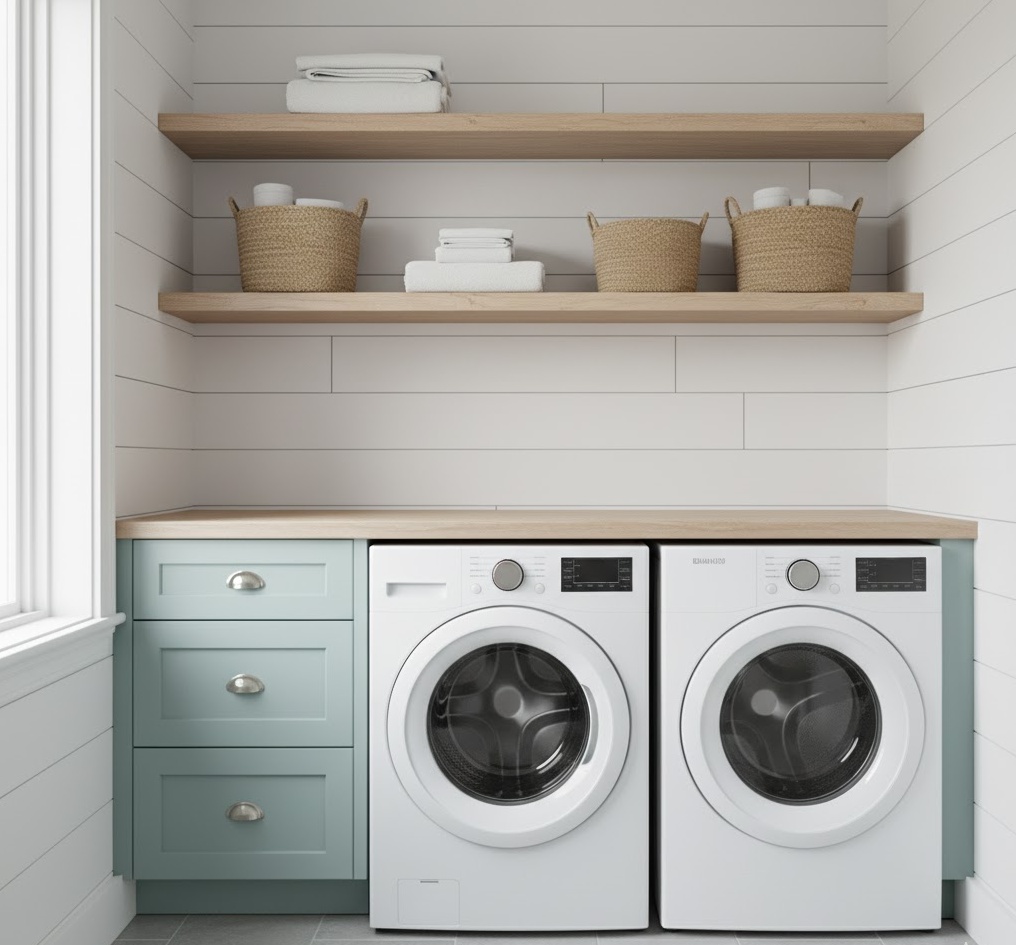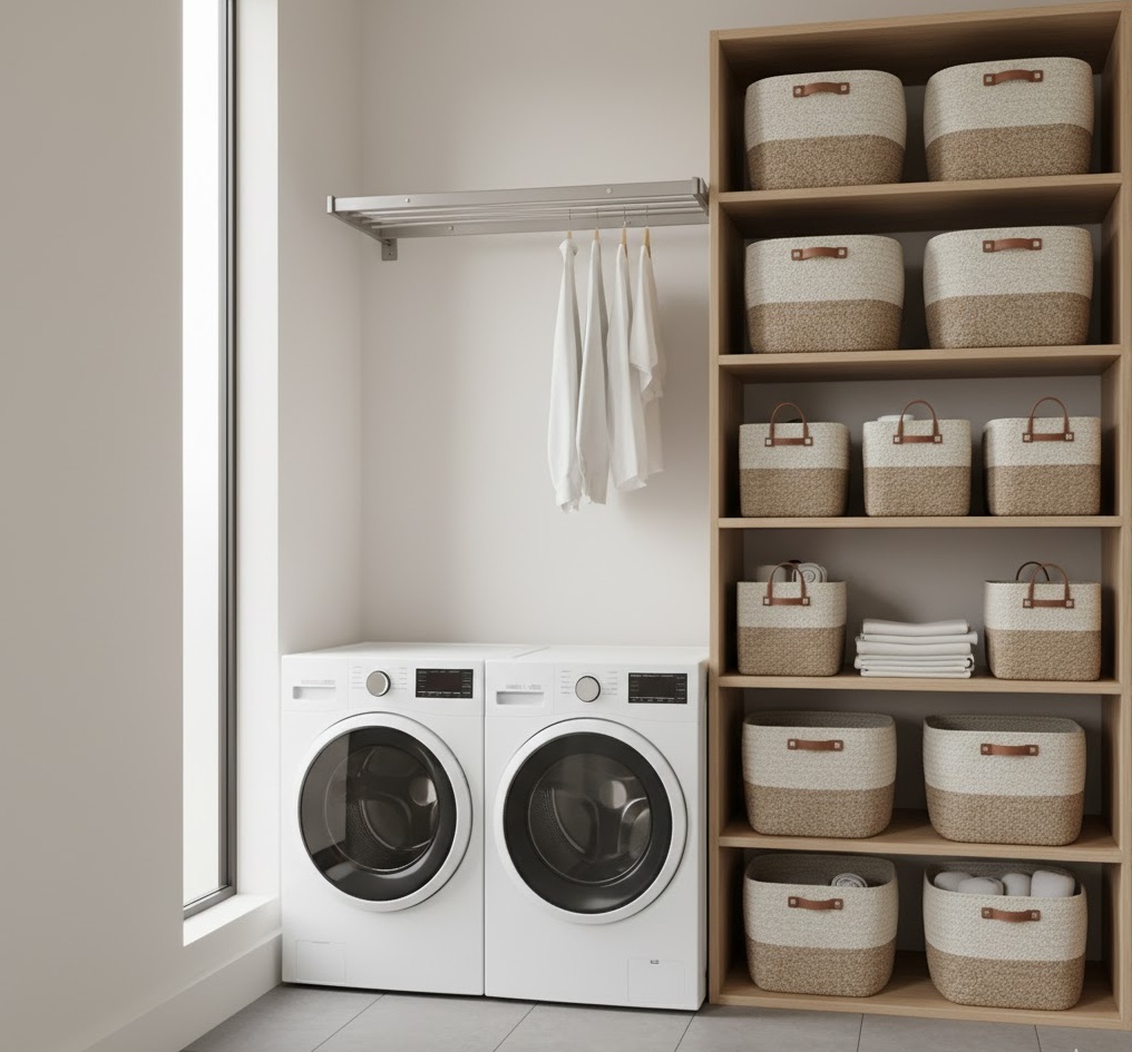 Embrace the ‘hygge’ philosophy with a Scandinavian laundry nook, focusing on light, natural materials, and functional simplicity. This design typically features pale wood cabinetry, white walls, and an abundance of natural light, creating an airy and serene atmosphere. Open shelving with neatly folded linens and minimalist accessories contribute to the uncluttered, organised aesthetic. Materials like birch plywood, white ceramic tiles, and natural fibre textiles are common, promoting a sense of calm and well-being. The mood is one of peaceful efficiency, making the laundry routine a more enjoyable and less stressful experience in a beautifully understated setting.