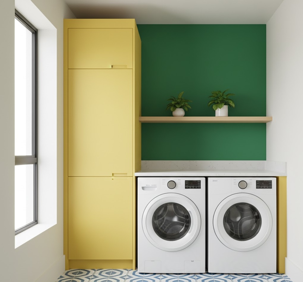 Inject personality and joy into your home with a colourful compact laundry design, turning a functional space into a vibrant statement. This style uses bold hues for cabinetry, feature walls, or patterned tiles, creating an energetic and playful atmosphere. Contrasting colours or complementary shades can be used to define zones or highlight specific features, adding visual interest. Practical storage solutions are often integrated with a creative flair, such as open shelving displaying colourful accessories or unique baskets. The mood is one of cheerful vitality and creative expression, making laundry day a brighter and more engaging experience.