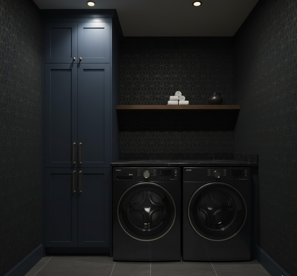 Introduce a touch of drama and sophistication with a dark and moody laundry space, defying the conventional bright utility room. This design embraces deep, rich colours such as charcoal grey, forest green, or navy blue for cabinetry and walls, creating an intimate and luxurious atmosphere. Brass or copper hardware and warm, diffused lighting add elegant accents, preventing the space from feeling too enclosed. Functionality is integrated with sleek, modern appliances and clever storage that blends seamlessly into the dark palette. The mood is one of unexpected elegance and cosy refinement, transforming a functional area into a stylish, personal sanctuary.