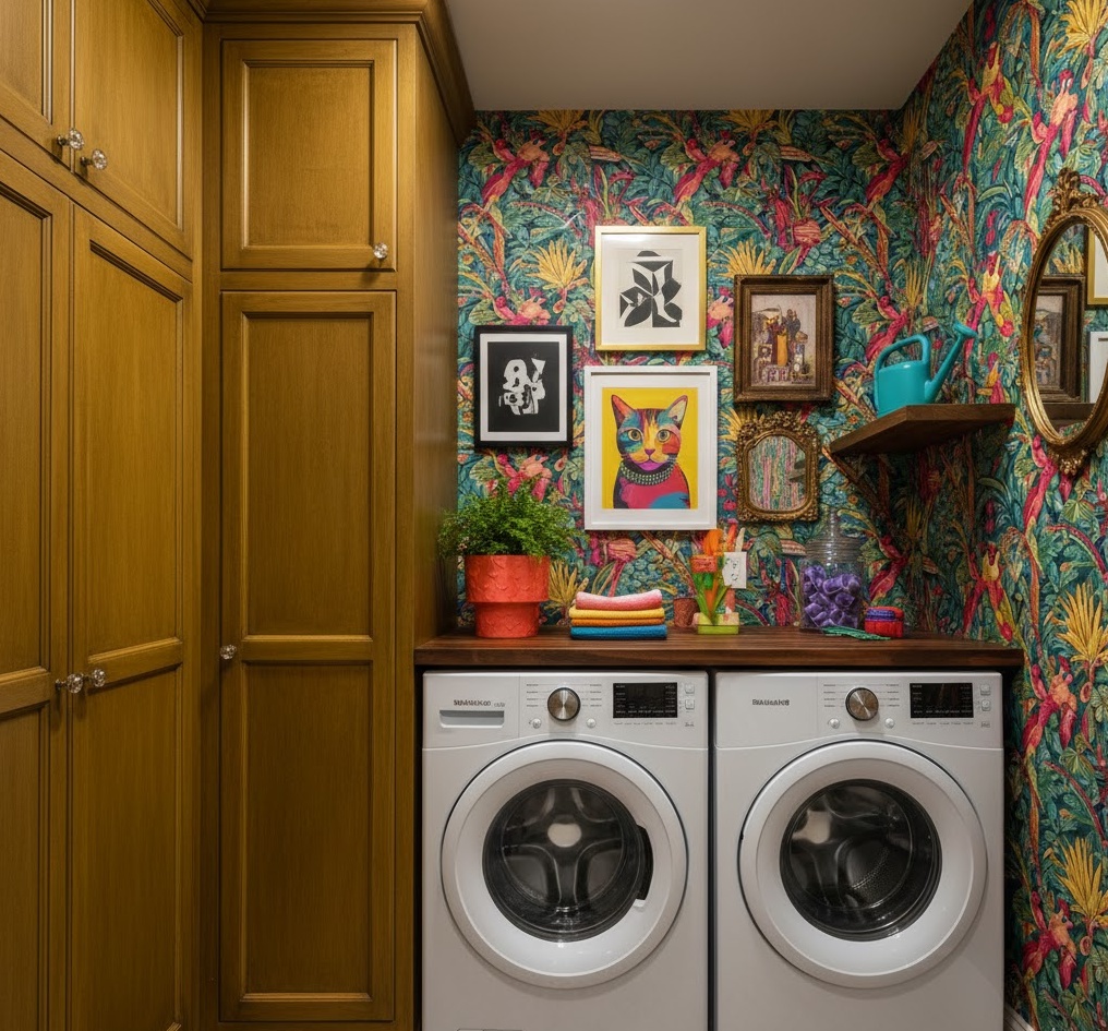 Express your unique style with an eclectic small laundry design, blending diverse elements to create a truly personal and vibrant space. This approach encourages mixing vintage finds with modern pieces, bold patterns with unexpected textures, and a varied colour palette. A curated collection of art, unique lighting fixtures, and repurposed furniture can transform the utility area into a conversation starter. Functionality is achieved through creative storage solutions that complement the varied aesthetic, such as antique cabinets or colourful open shelving. The mood is one of playful individuality and artistic flair, making laundry day feel like an inspiring journey through your personal style.