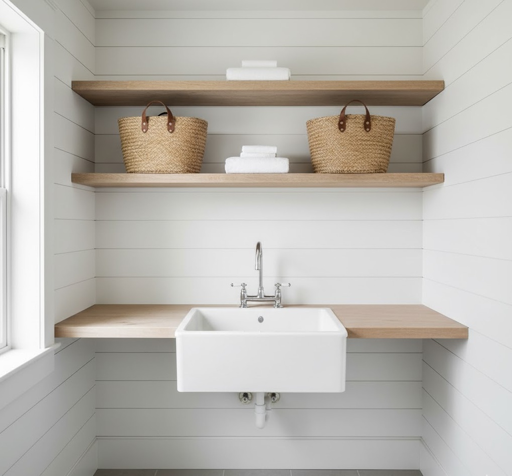 Create a warm and inviting atmosphere with a farmhouse compact laundry nook, blending rustic charm with practical functionality. This design often incorporates shiplap walls, open shelving crafted from distressed wood, and vintage-inspired fixtures, evoking a cosy, homely feel. A palette of soft whites, creams, and natural wood tones dominates, complemented by touches of black metal or brass for an authentic farmhouse look. Practical elements like a deep utility sink and woven baskets for storage are essential, ensuring the space is both charming and highly efficient for daily tasks. The overall mood is one of comforting nostalgia and down-to-earth utility, perfect for a busy household.