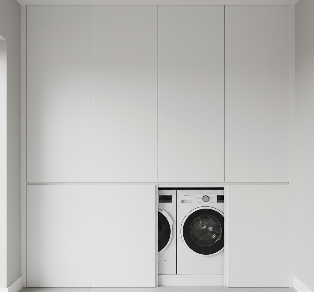 Maximise discretion and maintain a seamless aesthetic with hidden laundry cabinetry solutions, perfect for integrating utility into living spaces. This design conceals washing machines and tumble dryers behind flush, handle-less cabinet doors, creating an uninterrupted visual flow. The exterior often matches surrounding kitchen or hallway cabinetry, making the laundry area virtually invisible when not in use. A minimalist colour palette and sleek materials like matte laminates or painted MDF are common, ensuring a cohesive and sophisticated look. Functionality is paramount, with clever pull-out shelves and internal storage optimising the compact space. The mood is one of elegant concealment and clever space-saving, ideal for modern, open-plan living.