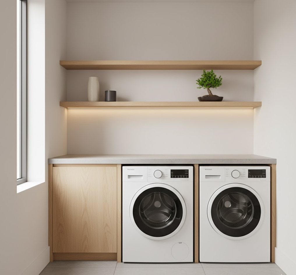 Discover serene harmony with a Japandi laundry aesthetic, a fusion of Japanese minimalism and Scandinavian warmth, perfect for a calming utility space. This design emphasises clean lines, natural materials, and a muted colour palette of soft greys, whites, and pale woods, creating a tranquil and uncluttered environment. Functionality is paramount, with thoughtful, integrated storage solutions that maintain the minimalist ethos and promote a sense of order. Materials like light oak, smooth concrete, and delicate ceramics are common, contributing to a refined yet approachable feel. The mood is one of peaceful simplicity and mindful living, transforming the laundry routine into a moment of calm.