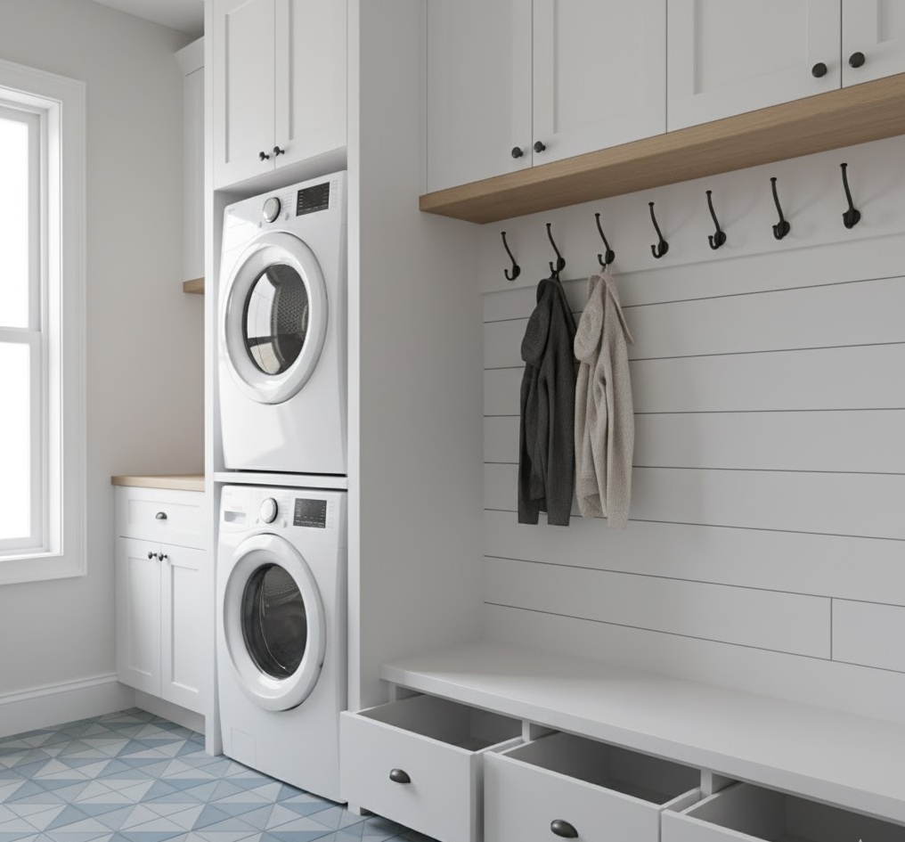 Combine practicality and organisation with a mudroom laundry combo, creating a highly functional entry point for busy households. This design integrates laundry appliances with essential mudroom features like bench seating, coat hooks, and shoe storage, making it a versatile transition space. Durable materials such as hard-wearing floor tiles, robust cabinetry, and easy-to-clean surfaces are paramount for handling daily wear and tear. A practical colour palette, often featuring earthy tones or classic whites, ensures a welcoming yet resilient environment. The mood is one of organised efficiency and family-friendly utility, simplifying daily routines from outdoor to indoor activities.